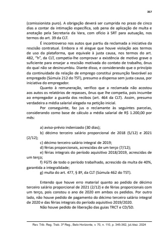 357Rev. Trib. Reg. Trab. 3ª Reg., Belo Horizonte, v. 70, n. 110, p. 345-362, jul./dez. 2024(comissionista puro). A obrigação deverá ser cumprida no prazo de cinco dias a contar da intimação específica, sob pena de aplicação de multa e anotação pela Secretaria da Vara, com ofício à SRT para autuação, nos termos do art. 39 da CLT.É incontroverso nos autos que partiu da reclamada a iniciativa da rescisão contratual. Embora a ré alegue que houve violação aos termos de uso da plataforma, que equivale à justa causa, nos termos do art. 482, “h”, da CLT, competia-lhe comprovar a existência de motivo grave o suficiente para ensejar a rescisão motivada do contato de trabalho, ônus do qual não se desincumbiu. Diante disso, e considerando que o princípio da continuidade da relação de emprego constitui presunção favorável ao empregado (Súmula 212 do TST), presumo a dispensa sem justa causa, por iniciativa do empregador.Quanto à remuneração, verifico que a reclamada não acostou aos autos os relatórios de repasses, ônus que lhe competia, pois incumbe ao empregador a guarda dos recibos (art. 464 da CLT). Assim, presumo verdadeira a média salarial alegada na petição inicial.Por conseguinte, faz jus o reclamante às seguintes parcelas, considerando como base de cálculo a média salarial de R$ 1.200,00 por mês:a) aviso-prévio indenizado (30 dias);b) décimo terceiro salário proporcional de 2018 (5/12) e 2021 (2/12);c) décimo terceiro salário integral de 2019;d) férias proporcionais, acrescidas de um terço (7/12);e) férias integrais do período aquisitivo 2018/2019, acrescidas de um terço;f) FGTS de todo o período trabalhado, acrescido da multa de 40%, garantida a integralidade;g) multa do art. 477, § 8º, da CLT (Súmula 462 do TST).Entendo que houve erro material quanto ao pedido de décimo terceiro salário proporcional de 2021 (2/12) e de férias proporcionais com um terço, pois constou o ano de 2020 em ambos os pedidos. Por outro lado, não houve pedido de pagamento do décimo terceiro salário integral de 2020 e das férias integrais do período aquisitivo 2019/2020.Não houve pedido de liberação das guias TRCT e CD/SD.
