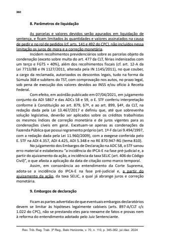 360Rev. Trib. Reg. Trab. 3ª Reg., Belo Horizonte, v. 70, n. 110, p. 345-362, jul./dez. 20248. Parâmetros de liquidaçãoAs parcelas e valores devidos serão apurados em liquidação de sentença, e ficam limitados às quantidades e valores assinalados na causa de pedir e no rol de pedidos (cf. arts. 141 e 492 do CPC), não incluídos nessa limitação os juros de mora e a correção monetária.Incidem recolhimentos previdenciários sobre as parcelas objeto da condenação (exceto sobre multa do art. 477 da CLT, férias indenizadas com um terço e FGTS + 40%), além dos recolhimentos fiscais (cf. art. 12-A da Lei 7713/88 e IN 1127/2011, alterada pela IN 1145/2011), no que couber, a cargo da reclamada, autorizados os descontos legais, tudo na forma da Súmula 368 e subitens do TST, com comprovação nos autos, no prazo legal, sob pena de execução dos valores devidos ao INSS e/ou ofício à Receita Federal.Com efeito, em acórdão publicado em 07/04/2021, em julgamento conjunto da ADI 5867 e das ADCs 58 e 59, o E. STF conferiu interpretação conforme à Constituição ao art. 879, §7º, e ao art. 899, §4º, da CLT, na redação dada pela Lei 13.467/2017 e definiu que, até que sobrevenha solução legislativa, deverão ser aplicados sobre os créditos trabalhistas os mesmos índices de correção monetária e de juros vigentes para as condenações cíveis em geral. Excetuam-se apenas as condenações da Fazenda Pública que possui regramento próprio (art. 1º-F da Lei 9.494/1997, com a redação dada pela Lei 11.960/2009), com a exegese conferida pelo E. STF na ADI 4.357, ADI 4.425, ADI 5.348 e no RE 870.947-RG (tema 810).No julgamento dos Embargos de Declaração na ADC 58, o STF sanou erro material e estabeleceu “a incidência do IPCA-E na fase pré-judicial e, a partir do ajuizamento da ação, a incidência da taxa SELIC (art. 406 do Código Civil)”, o que afasta a aplicação da data de citação como marco temporal.Assim, em consonância ao entendimento da Corte Suprema, adota-se a incidência do IPCA-E na fase pré-judicial e, a partir do ajuizamento da ação, da taxa SELIC, a qual já abrange juros e correção monetária.9. Embargos de declaraçãoFicam as partes advertidas de que eventuais embargos declaratórios devem se limitar às hipóteses legalmente cabíveis (arts. 897-A/CLT c/c 1.022 do CPC), não se prestando eles para reexame de fatos e provas nem à reforma do entendimento adotado pelo Juiz Sentenciante.