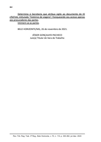 362Rev. Trib. Reg. Trab. 3ª Reg., Belo Horizonte, v. 70, n. 110, p. 345-362, jul./dez. 2024Determino à Secretaria que atribua sigilo ao documento de ID cf507e6, intitulado “histórico de viagens”, franqueando seu acesso apenas aos procuradores das partes.Intimem-se as partes.BELO HORIZONTE/MG, 26 de novembro de 2021.JÉSSER GONÇALVES PACHECOJuiz(a) Titular de Vara do Trabalho