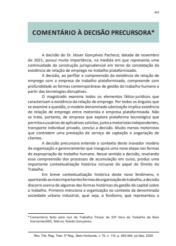 363Rev. Trib. Reg. Trab. 3ª Reg., Belo Horizonte, v. 70, n. 110, p. 363-364, jul./dez. 2024COMENTÁRIO À DECISÃO PRECURSORA** Comentário feito pelo Juiz do Trabalho Titular da 33ª Vara do Trabalho de Belo Horizonte/MG, Márcio Toledo Gonçalves.A decisão do Dr. Jésser Gonçalves Pacheco, datada de novembro de 2021, possui muita importância, na medida em que representa uma continuidade da construção jurisprudencial em torno da constatação da existência de relação de emprego no trabalho plataformizado.A decisão, ao perfilar a compreensão da existência de relação de emprego com a empresa de trabalho plataformizado, compreende com profundidade as formas contemporâneas de gestão do trabalho humano a partir das tecnologias disruptivas.O magistrado examina todos os elementos fático-jurídicos que caracterizam a existência da relação de emprego. Por todos os ângulos que se examine a questão, o modelo denominado uberização implica existência de relação de emprego entre motorista e empresa plataformizada. Não se trata, portanto, de empresa que explore plataforma tecnológica que permita a usuários de aplicativos solicitar, junto a motoristas independentes, transporte individual privado, conclui a decisão. Muito menos motoristas que contratem uma prestação de serviço de captação e angariação de clientes.A decisão precursora entende o contexto deste inovador modelo de organização e gerenciamento que inaugura uma nova etapa nas formas de expropriação do trabalho humano. Nesse sentido a decisão, revelando essa compreensão dos processos de acumulação em curso, produz uma importante contextualização histórica inclusive do papel do Direito do Trabalho.Em breve contextualização histórica deste novo fenômeno, e apontando as mais importantes formas de organização do trabalho, a decisão discorre acerca de algumas das formas históricas da gestão do capital sobre o trabalho. Primeiro menciona a organização no contexto da denominada sociedade urbana industrial, qual seja, o fordismo, que representou a
