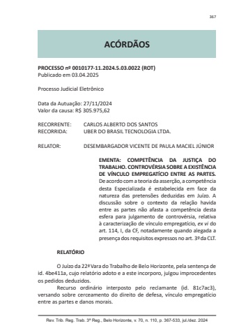 Rev. Trib. Reg. Trab. 3ª Reg., Belo Horizonte, v. 70, n. 110, p. 367-533, jul./dez. 2024367ACÓRDÃOSPROCESSO nº 0010177-11.2024.5.03.0022 (ROT)Publicado em 03.04.2025Processo Judicial EletrônicoData da Autuação: 27/11/2024Valor da causa: R$ 305.975,62RECORRENTE: CARLOS ALBERTO DOS SANTOSRECORRIDA: UBER DO BRASIL TECNOLOGIA LTDA.RELATOR: DESEMBARGADOR VICENTE DE PAULA MACIEL JÚNIOREMENTA: COMPETÊNCIA DA JUSTIÇA DO TRABALHO. CONTROVÉRSIA SOBRE A EXISTÊNCIA DE VÍNCULO EMPREGATÍCIO ENTRE AS PARTES.De acordo com a teoria da asserção, a competência desta Especializada é estabelecida em face da natureza das pretensões deduzidas em Juízo. A discussão sobre o contexto da relação havida entre as partes não afasta a competência desta esfera para julgamento de controvérsia, relativa à caracterização de vínculo empregatício, ex vi do art. 114, I, da CF, notadamente quando alegada a presença dos requisitos expressos no art. 3ºda CLT.RELATÓRIOO Juízo da 22ªVara do Trabalho de Belo Horizonte, pela sentença de id. 4be411a, cujo relatório adoto e a este incorporo, julgou improcedentes os pedidos deduzidos.Recurso ordinário interposto pelo reclamante (id. 81c7ac3), versando sobre cerceamento do direito de defesa, vínculo empregatício entre as partes e danos morais.