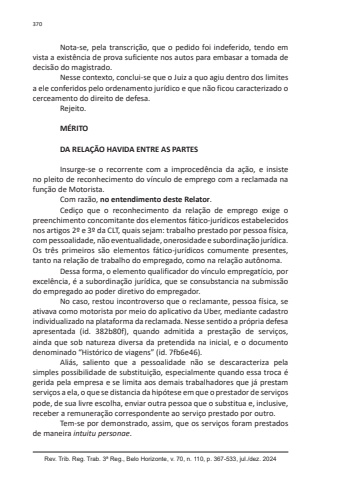 Rev. Trib. Reg. Trab. 3ª Reg., Belo Horizonte, v. 70, n. 110, p. 367-533, jul./dez. 2024370Nota-se, pela transcrição, que o pedido foi indeferido, tendo em vista a existência de prova suficiente nos autos para embasar a tomada de decisão do magistrado.Nesse contexto, conclui-se que o Juiz a quo agiu dentro dos limites a ele conferidos pelo ordenamento jurídico e que não ficou caracterizado o cerceamento do direito de defesa.Rejeito.MÉRITODA RELAÇÃO HAVIDA ENTRE AS PARTESInsurge-se o recorrente com a improcedência da ação, e insiste no pleito de reconhecimento do vínculo de emprego com a reclamada na função de Motorista.Com razão, no entendimento deste Relator.Cediço que o reconhecimento da relação de emprego exige o preenchimento concomitante dos elementos fático-jurídicos estabelecidos nos artigos 2º e 3º da CLT, quais sejam: trabalho prestado por pessoa física, com pessoalidade, não eventualidade, onerosidade e subordinação jurídica. Os três primeiros são elementos fático-jurídicos comumente presentes, tanto na relação de trabalho do empregado, como na relação autônoma.Dessa forma, o elemento qualificador do vínculo empregatício, por excelência, é a subordinação jurídica, que se consubstancia na submissão do empregado ao poder diretivo do empregador.No caso, restou incontroverso que o reclamante, pessoa física, se ativava como motorista por meio do aplicativo da Uber, mediante cadastro individualizado na plataforma da reclamada. Nesse sentido a própria defesa apresentada (id. 382b80f), quando admitida a prestação de serviços, ainda que sob natureza diversa da pretendida na inicial, e o documento denominado “Histórico de viagens” (id. 7fb6e46).Aliás, saliento que a pessoalidade não se descaracteriza pela simples possibilidade de substituição, especialmente quando essa troca é gerida pela empresa e se limita aos demais trabalhadores que já prestam serviços a ela, o que se distancia da hipótese em que o prestador de serviços pode, de sua livre escolha, enviar outra pessoa que o substitua e, inclusive, receber a remuneração correspondente ao serviço prestado por outro.Tem-se por demonstrado, assim, que os serviços foram prestados de maneira intuitu personae.