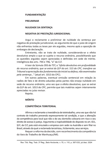 Rev. Trib. Reg. Trab. 3ª Reg., Belo Horizonte, v. 70, n. 110, p. 367-533, jul./dez. 2024375FUNDAMENTAÇÃOPRELIMINARNULIDADE DA SENTENÇANEGATIVA DE PRESTAÇÃO JURISDICIONALArgui o reclamante a preliminar de nulidade da sentença por negativa de prestação jurisdicional, ao argumento de que o juízo de origem não enfrentou todas as teses por ele arguidas, mesmo após a oposição de embargos de declaração.Entretanto, não se trata de nulidade, considerando-se o efeito devolutivo amplo a que se sujeita o recurso ordinário, possibilitando que as questões arguidas sejam apreciadas e definidas em sede de mérito. Inteligência dos arts. 794 e 796, “a” da CLT.A teor da Súmula 393 do TST, o “efeito devolutivo em profundidade do recurso ordinário, que se extrai do §1º do art. 515 do CPC, transfere ao Tribunal a apreciação dos fundamentos da inicial ou defesa, não examinados pela sentença...” (atual art. 1013 do CPC).Em outras palavras, eventual omissão sentencial em relação às razões de fato e de direito aduzidas pelas partes não enseja nulidade em sede de recurso ordinário, uma vez que o efeito devolutivo, que se extrai do §1º do art. 1013 do CPC, permite que tais matérias sejam inteiramente apreciadas no juízo revisor.Rejeito.MÉRITOCOMPETÊNCIA TERRITORIALAfirma o reclamante a inexistência de teletrabalho, uma vez que não há contrato de trabalho prevendo expressamente tal condição, e que a alteração da competência para local que não o do seu domicílio colocaria em risco o seu direito de acesso à justiça. Argumenta a inaplicabilidade do disposto no art. 651, §1º, da CLT, pois está vinculado a empresa com sede na Austrália e sem filial no Brasil, através da qual a reclamada terceirizou, ilicitamente, seus serviços.Requer a reforma da decisão, com reconhecimento da competência da Vara do Trabalho de Manhuaçu /MG.