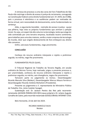 Rev. Trib. Reg. Trab. 3ª Reg., Belo Horizonte, v. 70, n. 110, p. 367-533, jul./dez. 2024378A remessa do processo a uma das varas do Foro Trabalhista de São Paulo não restringe o direito de acesso à justiça do reclamante, consagrado na Constituição Federal como direito fundamental (art. 5º, XXXV, da CF/88), pois o processo é eletrônico e as audiências podem ser realizadas de forma virtual, sem necessidade de deslocamento, como fundamentado na sentença.Aliás, o argumento brandido - restrição de acesso à justiça - quase soa pilhéria, haja vista os próprios fundamentos que animam a petição inicial. Ou seja, um expert de alto coturno na tecnologia, tanto que alega ter sido contratado por uma terceira empresa, localizada noutro continente, para trabalhar para uma das maiores, senão a maior empresa de tecnologia do mundo, dizer que singelo deslocamento de foro embaçará seu direito não convence.Enfim, sob esses fundamentos, nego provimento.CONCLUSÃOConheço do recurso ordinário interposto e rejeito a preliminar arguida; no mérito, nego-lhe provimento.FUNDAMENTOS PELOS QUAIS,O Tribunal Regional do Trabalho da Terceira Região, em sessão ordinária da Décima Turma, hoje realizada, julgou o presente processo e, por unanimidade, conheceu do recurso ordinário interposto e rejeito a preliminar arguida; no mérito, sem divergência, negou-lhe provimento.Tomaram parte no julgamento os Exmos.: Desembargador Ricardo Marcelo Silva (Relator), Desembargador Marcus Moura Ferreira e Desembargador Ricardo Antônio Mohallem (Presidente).Presente ao julgamento a il. representante do Ministério Público do Trabalho: Dra. Júnia Castelar Savaget.Sustentação oral: Dr. Jackson Pereira dos Reis pelo recorrentereclamante JACKSON PEREIRA DOS REIS (causa própria) e Dr. Juliano Augusto Carvalho de Castro, pela recorrida-reclamada GOOGLE BRASIL INTERNET LTDA.Belo Horizonte, 23 de abril de 2024.RICARDO MARCELO SILVARelator