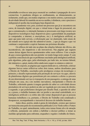 38Rev. Trib. Reg. Trab. 3ª Reg., Belo Horizonte, v. 70, n. 110, p. 37-62, jul./dez. 2024teletrabalho revelou-se uma peça essencial no combate à propagação do novo coronavírus. A pandemia obrigou ao confinamento, ao distanciamento, ao isolamento, sendo que, em muitas empresas e em muitos setores, a prossecução da atividade laboral foi mantida em novos moldes, à distância, com o precioso e indispensável auxílio das tecnologias hoje disponíveis.A pandemia veio, pois, acelerar um processo que já se encontrava em curso, de transição digital, em que o virtual toma o lugar do presencial, em que a comunicação e a interação humana se processam com largo recurso aos dispositivos tecnológicos hoje disponíveis para a generalidade da população (o computador, a internet, o smartphone, etc.). A inteligência artificial, as apps que para tudo servem, a robotização que vai alastrando, tudo sinais de um mundo novo (quiçá não tão admirável assim…) que já chegou e que vai continuar a surpreender a espécie humana nas próximas décadas.Os reflexos de tudo isto no plano das relações laborais são óbvios, são incontestáveis, são imparáveis e são irreversíveis. Nas páginas que seguem vamos deixar alguns breves apontamentos sobre esses reflexos. Com a noção de que a nossa ignorância não nos permite ver muito longe neste campo. E com a perfeita consciência de que os problemas suscitados pela inteligência artificial, pelo algoritmo, pelas apps, pela robotização, por tudo isto, no terreno laboral, são inúmeros e, quiçá, muitos deles ainda nem sequer os estamos a entrever.Pelo exposto, as páginas que seguem dedicam-se, sobretudo, a deixar algumas breves notas reflexivas sobre dois temas, ambos desafiantes para o Direito do Trabalho, suscitados pelo prodigioso avanço da tecnologia: o primeiro, o desafio representado pela prestação de serviços via apps, através de plataformas digitais que permitiram pôr em contacto a oferta e a procura de um determinado serviço (o transporte de um passageiro, a entrega de uma refeição em casa, etc.) em moldes inovadores, interpelando o Direito do Trabalho, sobretudo quanto à magna questão de saber se a atividade desses prestadores de serviços poderá ou não ser regulada por este ramo do direito; o segundo, o que poderíamos designar por desafio final, a questão de saber se, a prazo, o trabalho humano não vai perder a sua atual centralidade, se a inteligência artificial e os robôs não irão tornar dispensável que as pessoas humanas trabalhem e se, portanto, o Direito do Trabalho está condenado a desaparecer, acompanhando o inexorável decesso do trabalho humano.Antes disso, porém, ainda à guisa de introdução, cremos que merece ser transcrita uma parte do recentemente publicado Livro Verde sobre o Futuro do Trabalho, no qual, naturalmente, todos estes temas foram alvo de atenção e reflexão, justamente em ordem a habilitar o decisor político a tomar as medidas apropriadas para enfrentar, enquadrar e regular o trabalho do futuro.