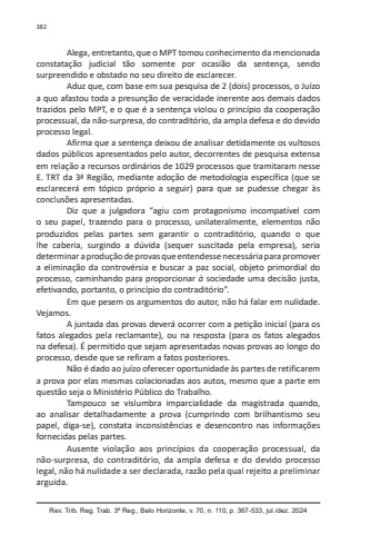 Rev. Trib. Reg. Trab. 3ª Reg., Belo Horizonte, v. 70, n. 110, p. 367-533, jul./dez. 2024382Alega, entretanto, que o MPT tomou conhecimento da mencionada constatação judicial tão somente por ocasião da sentença, sendo surpreendido e obstado no seu direito de esclarecer.Aduz que, com base em sua pesquisa de 2 (dois) processos, o Juízo a quo afastou toda a presunção de veracidade inerente aos demais dados trazidos pelo MPT, e o que é a sentença violou o princípio da cooperação processual, da não-surpresa, do contraditório, da ampla defesa e do devido processo legal.Afirma que a sentença deixou de analisar detidamente os vultosos dados públicos apresentados pelo autor, decorrentes de pesquisa extensa em relação a recursos ordinários de 1029 processos que tramitaram nesse E. TRT da 3ª Região, mediante adoção de metodologia específica (que se esclarecerá em tópico próprio a seguir) para que se pudesse chegar às conclusões apresentadas.Diz que a julgadora “agiu com protagonismo incompatível com o seu papel, trazendo para o processo, unilateralmente, elementos não produzidos pelas partes sem garantir o contraditório, quando o que lhe caberia, surgindo a dúvida (sequer suscitada pela empresa), seria determinar a produção de provas que entendesse necessária para promover a eliminação da controvérsia e buscar a paz social, objeto primordial do processo, caminhando para proporcionar à sociedade uma decisão justa, efetivando, portanto, o princípio do contraditório”.Em que pesem os argumentos do autor, não há falar em nulidade. Vejamos.A juntada das provas deverá ocorrer com a petição inicial (para os fatos alegados pela reclamante), ou na resposta (para os fatos alegados na defesa). É permitido que sejam apresentadas novas provas ao longo do processo, desde que se refiram a fatos posteriores.Não é dado ao juízo oferecer oportunidade às partes de retificarem a prova por elas mesmas colacionadas aos autos, mesmo que a parte em questão seja o Ministério Público do Trabalho.Tampouco se vislumbra imparcialidade da magistrada quando, ao analisar detalhadamente a prova (cumprindo com brilhantismo seu papel, diga-se), constata inconsistências e desencontro nas informações fornecidas pelas partes.Ausente violação aos princípios da cooperação processual, da não-surpresa, do contraditório, da ampla defesa e do devido processo legal, não há nulidade a ser declarada, razão pela qual rejeito a preliminar arguida.