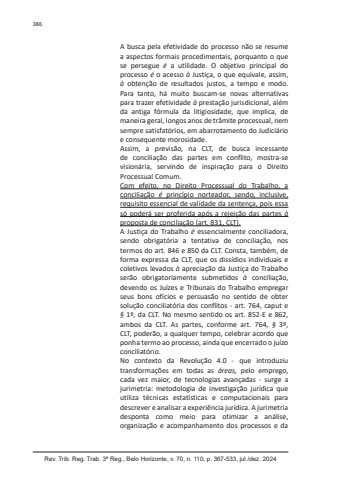 Rev. Trib. Reg. Trab. 3ª Reg., Belo Horizonte, v. 70, n. 110, p. 367-533, jul./dez. 2024386A busca pela efetividade do processo não se resume a aspectos formais procedimentais, porquanto o que se persegue é a utilidade. O objetivo principal do processo é o acesso à Justiça, o que equivale, assim, à obtenção de resultados justos, a tempo e modo. Para tanto, há muito buscam-se novas alternativas para trazer efetividade à prestação jurisdicional, além da antiga fórmula da litigiosidade, que implica, de maneira geral, longos anos de trâmite processual, nem sempre satisfatórios, em abarrotamento do Judiciário e consequente morosidade.Assim, a previsão, na CLT, de busca incessante de conciliação das partes em conflito, mostra-se visionária, servindo de inspiração para o Direito Processual Comum.Com efeito, no Direito Processual do Trabalho, a conciliação é princípio norteador, sendo, inclusive, requisito essencial de validade da sentença, pois essa só poderá ser proferida após a rejeição das partes àproposta de conciliação (art. 831, CLT).A Justiça do Trabalho é essencialmente conciliadora, sendo obrigatória a tentativa de conciliação, nos termos do art. 846 e 850 da CLT. Consta, também, de forma expressa da CLT, que os dissídios individuais e coletivos levados à apreciação da Justiça do Trabalho serão obrigatoriamente submetidos à conciliação, devendo os Juízes e Tribunais do Trabalho empregar seus bons ofícios e persuasão no sentido de obter solução conciliatória dos conflitos - art. 764, caput e § 1º, da CLT. No mesmo sentido os art. 852-E e 862, ambos da CLT. As partes, conforme art. 764, § 3º, CLT, poderão, a qualquer tempo, celebrar acordo que ponha termo ao processo, ainda que encerrado o juízo conciliatório.No contexto da Revolução 4.0 - que introduziu transformações em todas as áreas, pelo emprego, cada vez maior, de tecnologias avançadas - surge a jurimetria: metodologia de investigação jurídica que utiliza técnicas estatísticas e computacionais para descrever e analisar a experiência jurídica. A jurimetria desponta como meio para otimizar a análise, organização e acompanhamento dos processos e da
