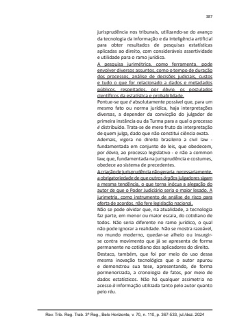Rev. Trib. Reg. Trab. 3ª Reg., Belo Horizonte, v. 70, n. 110, p. 367-533, jul./dez. 2024387jurisprudência nos tribunais, utilizando-se do avanço da tecnologia da informação e da inteligência artificial para obter resultados de pesquisas estatísticas aplicadas ao direito, com consideráveis assertividade e utilidade para o ramo jurídico.A pesquisa jurimétrica, como ferramenta, pode envolver diversos assuntos, como o tempo de duração dos processos, análise de decisões judiciais, custos e tudo o que for relacionado a dados e metadados públicos, respeitados, por óbvio, os postulados científicos da estatística e probabilidade.Pontue-se que é absolutamente possível que, para um mesmo fato ou norma jurídica, haja interpretações diversas, a depender da convicção do julgador de primeira instância ou da Turma para a qual o processo é distribuído. Trata-se de mero fruto da interpretação de quem julga, dado que não constitui ciência exata.Ademais, vigora no direito brasileiro a civil law - fundamentada em conjunto de leis, que obedecem, por óbvio, ao processo legislativo - e não a common law, que, fundamentada na jurisprudência e costumes, obedece ao sistema de precedentes.A criação de jurisprudência não geraria, necessariamente, a obrigatoriedade de que outros órgãos julgadores sigam a mesma tendência, o que torna inócua a alegação do autor de que o Poder Judiciário seria o maior lesado. A jurimetria, como instrumento de análise de risco para oferta de acordos, não fere legislação nacional.Não se pode olvidar que, na atualidade, a tecnologia faz parte, em menor ou maior escala, do cotidiano de todos. Não seria diferente no ramo jurídico, o qual não pode ignorar a realidade. Não se mostra razoável, no mundo moderno, quedar-se alheio ou insurgirse contra movimento que já se apresenta de forma permanente no cotidiano dos aplicadores do direito.Destaco, também, que foi por meio do uso dessa mesma inovação tecnológica que o autor apurou e demonstrou sua tese, apresentando, de forma pormenorizada, a cronologia de fatos, por meio de dados estatísticos. Não há qualquer assimetria no acesso à informação utilizada tanto pelo autor quanto pelo réu.