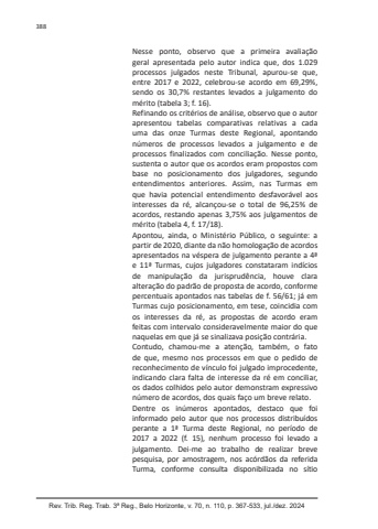 Rev. Trib. Reg. Trab. 3ª Reg., Belo Horizonte, v. 70, n. 110, p. 367-533, jul./dez. 2024388Nesse ponto, observo que a primeira avaliação geral apresentada pelo autor indica que, dos 1.029 processos julgados neste Tribunal, apurou-se que, entre 2017 e 2022, celebrou-se acordo em 69,29%, sendo os 30,7% restantes levados a julgamento do mérito (tabela 3; f. 16).Refinando os critérios de análise, observo que o autor apresentou tabelas comparativas relativas a cada uma das onze Turmas deste Regional, apontando números de processos levados a julgamento e de processos finalizados com conciliação. Nesse ponto, sustenta o autor que os acordos eram propostos com base no posicionamento dos julgadores, segundo entendimentos anteriores. Assim, nas Turmas em que havia potencial entendimento desfavorável aos interesses da ré, alcançou-se o total de 96,25% de acordos, restando apenas 3,75% aos julgamentos de mérito (tabela 4, f. 17/18).Apontou, ainda, o Ministério Público, o seguinte: a partir de 2020, diante da não homologação de acordos apresentados na véspera de julgamento perante a 4ª e 11ª Turmas, cujos julgadores constataram indícios de manipulação da jurisprudência, houve clara alteração do padrão de proposta de acordo, conforme percentuais apontados nas tabelas de f. 56/61; já em Turmas cujo posicionamento, em tese, coincidia com os interesses da ré, as propostas de acordo eram feitas com intervalo consideravelmente maior do que naquelas em que já se sinalizava posição contrária.Contudo, chamou-me a atenção, também, o fato de que, mesmo nos processos em que o pedido de reconhecimento de vínculo foi julgado improcedente, indicando clara falta de interesse da ré em conciliar, os dados colhidos pelo autor demonstram expressivo número de acordos, dos quais faço um breve relato.Dentre os inúmeros apontados, destaco que foi informado pelo autor que nos processos distribuídos perante a 1ª Turma deste Regional, no período de 2017 a 2022 (f. 15), nenhum processo foi levado a julgamento. Dei-me ao trabalho de realizar breve pesquisa, por amostragem, nos acórdãos da referida Turma, conforme consulta disponibilizada no sítio