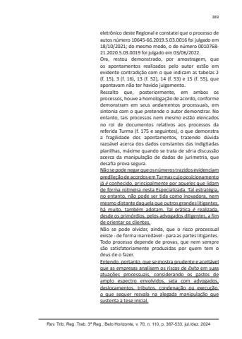 Rev. Trib. Reg. Trab. 3ª Reg., Belo Horizonte, v. 70, n. 110, p. 367-533, jul./dez. 2024389eletrônico deste Regional e constatei que o processo de autos número 10645-66.2019.5.03.0016 foi julgado em 18/10/2021; do mesmo modo, o de número 0010768-21.2020.5.03.0019 foi julgado em 03/06/2022.Ora, restou demonstrado, por amostragem, que os apontamentos realizados pelo autor estão em evidente contradição com o que indicam as tabelas 2 (f. 15), 3 (f. 16), 13 (f. 52), 14 (f. 53) e 15 (f. 55), que apontavam não ter havido julgamento.Ressalto que, posteriormente, em ambos os processos, houve a homologação de acordo, conforme demonstram em seus andamentos processuais, em sintonia com o que pretende o autor demonstrar. No entanto, tais processos nem mesmo estão elencados no rol de documentos relativos aos processos da referida Turma (f. 175 e seguintes), o que demonstra a fragilidade dos apontamentos, trazendo dúvida razoável acerca dos dados constantes das indigitadas planilhas, máxime quando se trata de séria discussão acerca da manipulação de dados de jurimetria, que desafia prova segura.Não se pode negar que os números trazidos evidenciam predileção de acordos em Turmas cujo posicionamento já é conhecido, principalmente por aqueles que lidam de forma rotineira nesta Especializada. Tal estratégia, no entanto, não pode ser tida como inovadora, nem mesmo distante daquela que outros grandes litigantes, há muito, também adotam. Tal prática é realizada, desde os primórdios, pelos advogados diligentes, a fim de orientar os clientes.Não se pode olvidar, ainda, que o risco processual existe - de forma inarredável - para as partes litigantes. Todo processo depende de provas, que nem sempre são satisfatoriamente produzidas por quem tem o ônus de o fazer.Entendo, portanto, que se mostra prudente e aceitável que as empresas analisem os riscos de êxito em suas atuações processuais, considerando os gastos de amplo espectro envolvidos, seja com advogados, deslocamentos, tributos, condenação ou execução, o que sequer resvala na alegada manipulação que sustenta a tese inicial.