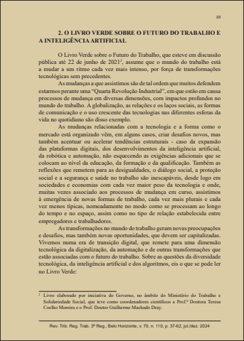 39Rev. Trib. Reg. Trab. 3ª Reg., Belo Horizonte, v. 70, n. 110, p. 37-62, jul./dez. 20242. O LIVRO VERDE SOBRE O FUTURO DO TRABALHO E A INTELIGÊNCIA ARTIFICIALO Livro Verde sobre o Futuro do Trabalho, que esteve em discussão pública até 22 de junho de 20212, assume que o mundo do trabalho está a mudar a um ritmo cada vez mais intenso, por força de transformações tecnológicas sem precedentes.As mudanças a que assistimos são de tal ordem que muitos defendem estarmos perante uma “Quarta Revolução Industrial”, em que estão em causa processos de mudança em diversas dimensões, com impactos profundos no mundo do trabalho. A globalização, as relações e os laços sociais, as formas de comunicação e o uso crescente das tecnologias nas diferentes esferas da vida no quotidiano são disso exemplo.As mudanças relacionadas com a tecnologia e a forma como o mercado está organizado vêm, em alguns casos, criar desafios novos, mas também acentuar ou acelerar tendências estruturais - caso da expansão das plataformas digitais, dos desenvolvimentos da inteligência artificial, da robótica e automação, não esquecendo as exigências adicionais que se colocam ao nível da educação, da formação e da qualificação. Também as reflexões que remetem para as desigualdades, o diálogo social, a proteção social e a segurança e saúde no trabalho são inescapáveis, desde logo em sociedades e economias com cada vez maior peso da tecnologia e onde, muitas vezes associado aos processos de mudança em curso, assistimos à emergência de novas formas de trabalho, cada vez mais plurais e cada vez menos típicas, nomeadamente no modo como se processam ao longo do tempo e no espaço, assim como no tipo de relação estabelecida entre empregadores e trabalhadores.As transformações no mundo do trabalho geram novas preocupações e desafios, mas também novas oportunidades, que devem ser capitalizadas. Vivemos numa era de transição digital, que remete para uma dimensão tecnológica da digitalização, da automação e de outras transformações que estão associadas com o futuro do trabalho. Sobre as questões da diversidade tecnológica, da inteligência artificial e dos algoritmos, eis o que se pode ler no Livro Verde:2 Livro elaborado por iniciativa do Governo, no âmbito do Ministério do Trabalho e Solidariedade Social, que teve como coordenadores científi cos a Prof.ª Doutora Teresa Coelho Moreira e o Prof. Doutor Guilherme Machado Dray.
