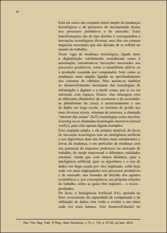 40Rev. Trib. Reg. Trab. 3ª Reg., Belo Horizonte, v. 70, n. 110, p. 37-62, jul./dez. 2024Está em curso um conjunto muito amplo de mudanças tecnológicas e de processos de incorporação destas nos processos produtivos e de mercado. Estas transformações são de tipo distinto e correspondem a inovações tecnológicas diversas, mas têm em comum impactos crescentes que não deixam de se refletir no mundo do trabalho.Nesta vaga de mudança tecnológica, ligada tanto à digitalização estritamente considerada como à automação, encontram-se inovações associadas aos processos produtivos, como a manufatura aditiva ou a produção assistida por computador, bem como as mudanças mais amplas ligadas ao aprofundamento dos sistemas de robótica. Mas assiste-se também ao desenvolvimento incessante das tecnologias de informação e digitais e o modo como, por si ou em interação com espaços físicos, elas interagem com as diferentes dimensões da economia e da sociedade: as plataformas da cloud, o armazenamento e uso de dados em larga escala, os sistemas de gestão aos mais diversos níveis, sistemas de sensores, a chamada “internet das coisas” (IoT), tecnologias como machinelearning ou as chamadas tecnologias imersivas (mixedreality), para citar apenas alguns exemplos.Este conjunto amplo, e ele próprio mutável, de focos de inovação tecnológica tem na inteligência artificial e nos algoritmos duas das frentes mais estruturantes e ativas da mudança, e em particular da mudança com um potencial de impactos poderosos no mercado de trabalho, de modo transversal a diferentes realidades setoriais. Ainda que com ritmos distintos, quer a inteligência artificial, quer os algoritmos e o uso de dados em larga escala por eles implicado, estão hoje cada vez mais impregnados nos processos produtivos e de mercado, nas tomadas de decisão dos agentes económicos e, por consequência, nas próprias relações de trabalho, sobre as quais têm impactos - e riscos - profundos.De facto, a Inteligência Artificial (IA), apoiada no forte crescimento da capacidade de computação e da utilização de dados, tem vindo a evoluir a um ritmo cada vez mais intenso. Este desenvolvimento no