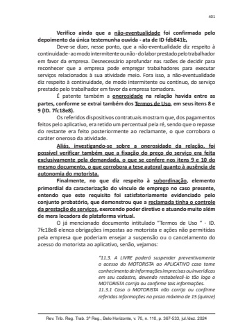 Rev. Trib. Reg. Trab. 3ª Reg., Belo Horizonte, v. 70, n. 110, p. 367-533, jul./dez. 2024401Verifico ainda que a não-eventualidade foi confirmada pelo depoimento da única testemunha ouvida - ata de ID fdb841bDeve-se dizer, nesse ponto, que a não-eventualidade diz respeito à continuidade - ao modo intermitente ou não - do labor prestado pelo trabalhador em favor da empresa. Desnecessário aprofundar nas razões de decidir para reconhecer que a empresa pode empregar trabalhadores para executar serviços relacionados à sua atividade meio. Fora isso, a não-eventualidade diz respeito à continuidade, de modo intermitente ou contínuo, do serviço prestado pelo trabalhador em favor da empresa tomadora.É patente também a onerosidade na relação havida entre as partes, conforme se extrai também dos Termos de Uso, em seus itens 8 e 9 (ID. 7fc18e8).Os referidos dispositivos contratuais mostram que, dos pagamentos feitos pelo aplicativo, era retido um percentual pela ré, sendo que o repasse do restante era feito posteriormente ao reclamante, o que corrobora o caráter oneroso da atividade.Aliás, investigando-se sobre a onerosidade da relação, foi possível verificar também que a fixação do preço do serviço era feita exclusivamente pela demandada, o que se confere nos itens 9 e 10 do mesmo documento, o que corrobora a tese autoral quanto à ausência de autonomia do motorista.Finalmente, no que diz respeito à subordinação, elemento primordial da caracterização do vínculo de emprego no caso presente, entendo que este requisito foi satisfatoriamente evidenciado pelo conjunto probatório, que demonstrou que a reclamada tinha o controle da prestação de serviços, exercendo poder diretivo e atuando muito além de mera locadora de plataforma virtual.O já mencionado documento intitulado “Termos de Uso “ - ID. 7fc18e8 elenca obrigações impostas ao motorista e ações não permitidas pela empresa que poderiam ensejar a suspensão ou o cancelamento do acesso do motorista ao aplicativo, senão, vejamos:“11.3. A LIVRE poderá suspender preventivamente o acesso do MOTORISTA ao APLICATIVO caso tome conhecimento de informações imprecisas ou inverídicas em seu cadastro, devendo restabelecê-lo tão logo o MOTORISTA corrija ou confirme tais informações.11.3.1 Caso o MOTORISTA não corrija ou confirme referidas informações no prazo máximo de 15 (quinze)