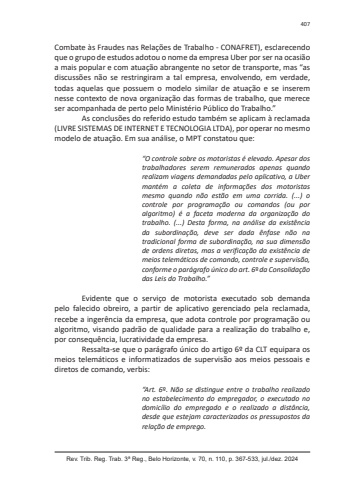 Rev. Trib. Reg. Trab. 3ª Reg., Belo Horizonte, v. 70, n. 110, p. 367-533, jul./dez. 2024407Combate às Fraudes nas Relações de Trabalho - CONAFRET), esclarecendo que o grupo de estudos adotou o nome da empresa Uber por ser na ocasião a mais popular e com atuação abrangente no setor de transporte, mas “as discussões não se restringiram a tal empresa, envolvendo, em verdade, todas aquelas que possuem o modelo similar de atuação e se inserem nesse contexto de nova organização das formas de trabalho, que merece ser acompanhada de perto pelo Ministério Público do Trabalho.”As conclusões do referido estudo também se aplicam à reclamada (LIVRE SISTEMAS DE INTERNET E TECNOLOGIA LTDA), por operar no mesmo modelo de atuação. Em sua análise, o MPT constatou que:“O controle sobre os motoristas é elevado. Apesar dos trabalhadores serem remunerados apenas quando realizam viagens demandadas pelo aplicativo, a Uber mantém a coleta de informações dos motoristas mesmo quando não estão em uma corrida. (...) o controle por programação ou comandos (ou por algoritmo) é a faceta moderna da organização do trabalho. (...) Desta forma, na análise da existência da subordinação, deve ser dada ênfase não na tradicional forma de subordinação, na sua dimensão de ordens diretas, mas a verificação da existência de meios telemáticos de comando, controle e supervisão, conforme o parágrafo único do art. 6ºda Consolidação das Leis do Trabalho.”Evidente que o serviço de motorista executado sob demanda pelo falecido obreiro, a partir de aplicativo gerenciado pela reclamada, recebe a ingerência da empresa, que adota controle por programação ou algoritmo, visando padrão de qualidade para a realização do trabalho e, por consequência, lucratividade da empresa.Ressalta-se que o parágrafo único do artigo 6º da CLT equipara os meios telemáticos e informatizados de supervisão aos meios pessoais e diretos de comando, verbis:“Art. 6º. Não se distingue entre o trabalho realizado no estabelecimento do empregador, o executado no domicílio do empregado e o realizado a distância, desde que estejam caracterizados os pressupostos da relação de emprego.