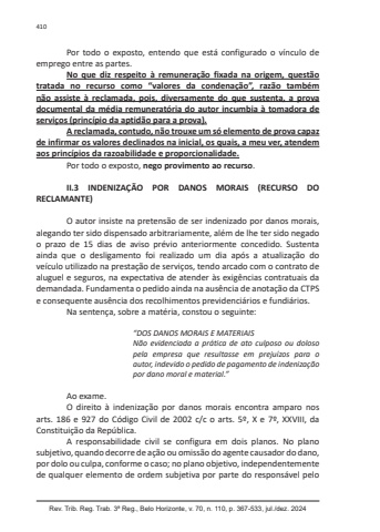 Rev. Trib. Reg. Trab. 3ª Reg., Belo Horizonte, v. 70, n. 110, p. 367-533, jul./dez. 2024410Por todo o exposto, entendo que está configurado o vínculo de emprego entre as partes.No que diz respeito à remuneração fixada na origem, questão tratada no recurso como “valores da condenação”, razão também não assiste à reclamada, pois, diversamente do que sustenta, a prova documental da média remuneratória do autor incumbia à tomadora de serviços (princípio da aptidão para a prova).A reclamada, contudo, não trouxe um só elemento de prova capaz de infirmar os valores declinados na inicial, os quais, a meu ver, atendem aos princípios da razoabilidade e proporcionalidade.Por todo o exposto, nego provimento ao recurso.II.3 INDENIZAÇÃO POR DANOS MORAIS (RECURSO DO RECLAMANTE)O autor insiste na pretensão de ser indenizado por danos morais, alegando ter sido dispensado arbitrariamente, além de lhe ter sido negado o prazo de 15 dias de aviso prévio anteriormente concedido. Sustenta ainda que o desligamento foi realizado um dia após a atualização do veículo utilizado na prestação de serviços, tendo arcado com o contrato de aluguel e seguros, na expectativa de atender às exigências contratuais da demandada. Fundamenta o pedido ainda na ausência de anotação da CTPS e consequente ausência dos recolhimentos previdenciários e fundiários.Na sentença, sobre a matéria, constou o seguinte:“DOS DANOS MORAIS E MATERIAISNão evidenciada a prática de ato culposo ou doloso pela empresa que resultasse em prejuízos para o autor, indevido o pedido de pagamento de indenização por dano moral e material.”Ao exame.O direito à indenização por danos morais encontra amparo nos arts. 186 e 927 do Código Civil de 2002 c/c o arts. 5º, X e 7º, XXVIII, da Constituição da República.A responsabilidade civil se configura em dois planos. No plano subjetivo, quando decorre de ação ou omissão do agente causador do dano, por dolo ou culpa, conforme o caso; no plano objetivo, independentemente de qualquer elemento de ordem subjetiva por parte do responsável pelo
