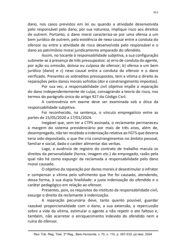 Rev. Trib. Reg. Trab. 3ª Reg., Belo Horizonte, v. 70, n. 110, p. 367-533, jul./dez. 2024411dano, nos casos previstos em lei ou quando a atividade desenvolvida pelo responsável pelo dano, por sua natureza, implique risco aos direitos de outrem. Portanto, o dano moral caracteriza-se por uma ofensa a um bem jurídico de outrem, pela existência de nexo causal entre a conduta do ofensor ou entre a atividade de risco desenvolvida pelo responsável e o dano ao patrimônio moral juridicamente amparado do ofendido.Assim, no tocante à responsabilidade subjetiva, a sua configuração submete-se à presença de três pressupostos: a) erro de conduta do agente, por ação ou omissão, dolosa ou culposa do ofensor; b) ofensa a um bem jurídico (dano) e c) nexo causal entre a conduta do ofensor e o dano verificado. Presentes os sobreditos pressupostos, tem a vítima o direito às reparações pelos danos morais sofridos (dor e constrangimento impostos).Por sua vez, a responsabilidade civil objetiva impõe a reparação do dano independentemente de culpa, consagrando a teoria do risco, nos termos do parágrafo único do artigo 927 do Código Civil.A controvérsia em exame deve ser examinada sob a ótica da responsabilidade subjetiva.Foi reconhecido, na sentença, o vínculo empregatício entre as partes de 15/05/2020 a 17/01/2024.Inegável que, sem ter a CTPS assinada, o reclamante permaneceu à margem do sistema previdenciário por mais de três anos, além de, desempregado, não ter recebido a indenização relativa ao FGTS que deveria teria sido depositado, o que lhe cria constrangimentos no âmbito pessoal, familiar e social, dado o caráter alimentar das verbas.Logo, a ausência de registro do contrato de trabalho macula os direitos da personalidade (honra, imagem etc.) do empregado, razão pela qual não há como expungir da reclamada a responsabilidade pelo dano moral causado.O objetivo da reparação por danos morais é desestimular o infrator e compensar a vítima pelo sofrimento que lhe foi causado, atendendo, dessa forma, à sua dupla finalidade: a justa indenização do ofendido e o caráter pedagógico em relação ao ofensor.Presentes, pois, os requisitos do instituto da responsabilidade civil, exsurge o direito da reclamante à indenização.A reparação pecuniária deve, tanto quanto possível, guardar razoável proporcionalidade com o dano, a sua extensão, a repercussão sobre a vida da vítima, estimular o agente a não repetir o ato faltoso e, também, não acarretar o enriquecimento indevido do ofendido nem a ruína do ofensor.