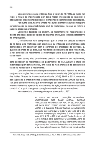 Rev. Trib. Reg. Trab. 3ª Reg., Belo Horizonte, v. 70, n. 110, p. 367-533, jul./dez. 2024412Considerando esses critérios, fixo o valor de R$7.000,00 (sete mil reais) a título de indenização por dano moral, mostrando-se razoável e adequado às circunstâncias do caso, atendendo à sua finalidade pedagógica.Por outro lado, não vislumbro nos autos elementos suficientes para caracterização da responsabilidade civil da reclamada, no que se refere à suposta dispensa arbitrária.Conforme decidido na origem, ao reclamante foi reconhecido o direito a todas as parcelas típicas da dispensa imotivada - direito potestativo do empregador.O reclamante não comprovou que a troca do veículo cadastro da ré teria sido motivada por promessa ou intenção demonstrada pela demandada em continuar com o contrato de prestação de serviços. E, quanto ao prazo de 15 dias, que não teria sido respeitado pela reclamada, já foi deferido ao reclamante a indenização pelo aviso prévio legal não trabalhado.Isso posto, dou provimento parcial ao recurso do reclamante, para condenar as reclamadas ao pagamento de R$7.000,00 a título de indenização por danos morais, em razão da não anotação do contrato de trabalho havido com o reclamante.Considerando o decidido pelo Supremo Tribunal Federal na análise conjunta das Ações Declaratórias de Constitucionalidade (ADCs) 58 e 59 e das Ações Diretas de Inconstitucionalidade (ADIS) 5867 e 6021, entendo por superado o entendimento jurisprudencial contido na Súmula 439 do c. TST, pelo que determinou que a indenização por danos morais seja corrigida monetariamente, a partir do ajuizamento da ação, com base na variação da taxa SELIC, a qual já engloba correção monetária e juros moratórios.Nesse sentido, cito o seguinte precedente do c. TST:6. JUROS DE MORA. CORREÇÃO MONETÁRIA. INDENIZAÇÃO POR DANO MORAL. DECISÃO VINCULANTE PROFERIDA NA ADC Nº 58, APLICAÇÃO DÁ TAXA SELIC. TERMO INICIAL. AJUIZAMENTO DA AÇÃO. I. O Supremo Tribunal Federal, no julgamento conjunto das ADI 6.021 e 5.867 e das ADC 58 e 59, conferiu interpretação conforme à Constituição aos arts. 879, § 70, e 899, § 4º, da CLT (redação da Lei nº 13.467/2017) para determinar a aplicação, para as condenações trabalhistas, até que sobrevenha solução legislativa, dos “mesmos índices de correção monetária e de juros vigentes para as hipóteses de condenações