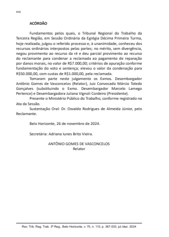 Rev. Trib. Reg. Trab. 3ª Reg., Belo Horizonte, v. 70, n. 110, p. 367-533, jul./dez. 2024416ACÓRDÃOFundamentos pelos quais, o Tribunal Regional do Trabalho da Terceira Região, em Sessão Ordinária da Egrégia Décima Primeira Turma, hoje realizada, julgou o referido processo e, à unanimidade, conheceu dos recursos ordinários interpostos pelas partes; no mérito, sem divergência, negou provimento ao recurso da ré e deu parcial provimento ao recurso do reclamante para condenar a reclamada ao pagamento de reparação por danos morais, no valor de R$7.000,00; critérios de apuração conforme fundamentação do voto e sentença; elevou o valor da condenação para R$50.000,00, com custas de R$1.000,00, pela reclamada.Tomaram parte neste julgamento os Exmos. Desembargador Antônio Gomes de Vasconcelos (Relator), Juiz Convocado Márcio Toledo Gonçalves (substituindo o Exmo. Desembargador Marcelo Lamego Pertence) e Desembargadora Juliana Vignoli Cordeiro (Presidente).Presente o Ministério Público do Trabalho, conforme registrado na Ata da Sessão.Sustentação Oral: Dr. Osvaldo Rodrigues de Almeida Júnior, pelo Reclamante.Belo Horizonte, 26 de novembro de 2024.Secretária: Adriana Iunes Brito Vieira.ANTÔNIO GOMES DE VASCONCELOSRelator