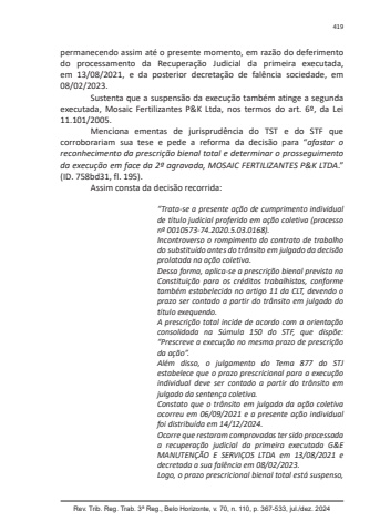 Rev. Trib. Reg. Trab. 3ª Reg., Belo Horizonte, v. 70, n. 110, p. 367-533, jul./dez. 2024419permanecendo assim até o presente momento, em razão do deferimento do processamento da Recuperação Judicial da primeira executada, em 13/08/2021, e da posterior decretação de falência sociedade, em 08/02/2023.Sustenta que a suspensão da execução também atinge a segunda executada, Mosaic Fertilizantes P&K Ltda, nos termos do art. 6º, da Lei 11.101/2005.Menciona ementas de jurisprudência do TST e do STF que corroborariam sua tese e pede a reforma da decisão para “afastar o reconhecimento da prescrição bienal total e determinar o prosseguimento da execução em face da 2ª agravada, MOSAIC FERTILIZANTES P&K LTDA.” (ID. 758bd31, fl. 195).Assim consta da decisão recorrida:“Trata-se a presente ação de cumprimento individual de título judicial proferido em ação coletiva (processo nº 0010573-74.2020.5.03.0168).Incontroverso o rompimento do contrato de trabalho do substituído antes do trânsito em julgado da decisão prolatada na ação coletiva.Dessa forma, aplica-se a prescrição bienal prevista na Constituição para os créditos trabalhistas, conforme também estabelecido no artigo 11 da CLT, devendo o prazo ser contado a partir do trânsito em julgado do título exequendo.A prescrição total incide de acordo com a orientação consolidada na Súmula 150 do STF, que dispõe: “Prescreve a execução no mesmo prazo de prescrição da ação”.Além disso, o julgamento do Tema 877 do STJ estabelece que o prazo prescricional para a execução individual deve ser contado a partir do trânsito em julgado da sentença coletiva.Constato que o trânsito em julgado da ação coletiva ocorreu em 06/09/2021 e a presente ação individual foi distribuída em 14/12/2024.Ocorre que restaram comprovadas ter sido processada a recuperação judicial da primeira executada G&E MANUTENÇÃO E SERVIÇOS LTDA em 13/08/2021 e decretada a sua falência em 08/02/2023.Logo, o prazo prescricional bienal total está suspenso,