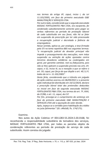 Rev. Trib. Reg. Trab. 3ª Reg., Belo Horizonte, v. 70, n. 110, p. 367-533, jul./dez. 2024420nos termos do artigo 6º, caput, inciso I, da Lei 11.101/2005, em face da primeira executada G&E MANUTENÇÃO E SERVIÇOS LTDA.Por outro lado, considerando que a segunda executada MOSAIC FERTILIZANTES P&K LTDA, ora excipiente, foi condenada subsidiariamente somente para pagar as verbas referentes ao período da prestação laboral de cada substituído em seu favor, não há se falar em suspensão da prescrição por ter sido processada a recuperação judicial e decretada a falência da empregadora.Nesse sentido, aplica-se, por analogia, a tese firmada pelo STJ no tema repetitivo 885 nos seguintes termos: “a recuperação judicial do devedor principal não impede o prosseguimento das execuções, nem induz suspensão ou extinção de ações ajuizadas contra terceiros devedores solidários ou coobrigados em geral, por garantia cambial, real ou fidejussória, pois não se lhes aplicam a suspensão prevista nos arts. 6º, caput, e 52, inciso III, ou a novação a que se refere o art. 59, caput, por força do que dispõe o art. 49, § 1º, todos da Lei n. 11.101/2005”.Desta feita, considerando que o trânsito em julgado da ação coletiva ocorreu em 06/09/2021 e a presente ação individual foi distribuída em 14/12/2024, declaro a prescrição bienal total das pretensões deduzidas na inicial em face da segunda executada MOSAIC FERTILIZANTES P&K LTDA, nos termos do art. 7º, XXIX, da CF/88, e art. 11, caput, da CLT.Por fim, prossiga-se o cumprimento da sentença em face da primeira executada G&E MANUTENÇÃO E SERVIÇOS LTDA até a apuração do valor devido.Após, expeça-se a certidão para habilitação do crédito no juízo falimentar.” (ID. c4fe5d0, fls. 174/175).Examino.Nos autos da Ação Coletiva nº 0011283-55.2024.5.03.0168, foi reconhecida a responsabilidade subsidiária da tomadora dos serviços, MOSAIC FERTILIZANTES P&K LTDA, por todas as parcelas objeto da condenação referentes ao período de prestação de serviço de cada substituído. Assim constou do julgado: