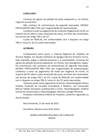 Rev. Trib. Reg. Trab. 3ª Reg., Belo Horizonte, v. 70, n. 110, p. 367-533, jul./dez. 2024423CONCLUSÃOConheço do agravo de petição da parte exequente e, no mérito, nego-lhe provimento.Não conheço da contraminuta da segunda executada, MOSAIC FERTILIZANTES P&K LTDA, por irregularidade de representação.Condeno o autor ao pagamento de multa por litigância de má-fé, no importe de 5% sobre o valor atualizado da causa, em favor das reclamadas, nos termos do artigo 793-C da CLT.Custas de R$44,26, em conformidade com o disposto no artigo 789-A, inciso IV, da CLT, pelas executadas.ACÓRDÃOFundamentos pelos quais, o Tribunal Regional do Trabalho da Terceira Região, em Sessão Ordinária da Egrégia Décima Primeira Turma, hoje realizada, julgou o referido processo e, à unanimidade, conheceu do agravo de petição da parte exequente; no mérito, sem divergência, negoulhe provimento; não conheceu da contraminuta da segunda executada, MOSAIC FERTILIZANTES P&K LTDA, por irregularidade de representação; condenou o autor ao pagamento de multa por litigância de má-fé, no importe de 5% sobre o valor atualizado da causa, em favor das reclamadas, nos termos do artigo 793-C da CLT; custas de R$44,26, em conformidade com o disposto no artigo 789-A, inciso IV, da CLT, pelas executadas.Tomaram parte neste julgamento os Exmos. Desembargador Marco Antônio Paulinelli de Carvalho (Presidente e Relator), Juiz Convocado Márcio Toledo Gonçalves (substituindo o Exmo. Desembargador Antônio Gomes de Vasconcelos) e Desembargador Marcelo Lamego Pertence.Presente o Ministério Público do Trabalho, conforme registrado na Ata da Sessão.Belo Horizonte, 21 de maio de 2025.Secretária: Adriana Iunes Brito Vieira.MARCO ANTONIO PAULINELLI DE CARVALHORelator