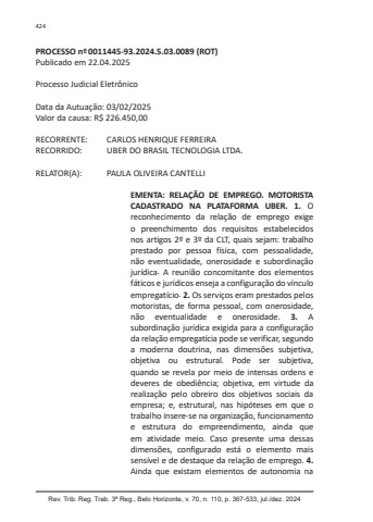Rev. Trib. Reg. Trab. 3ª Reg., Belo Horizonte, v. 70, n. 110, p. 367-533, jul./dez. 2024424PROCESSO nº 0011445-93.2024.5.03.0089 (ROT)Publicado em 22.04.2025Processo Judicial EletrônicoData da Autuação: 03/02/2025Valor da causa: R$ 226.450,00RECORRENTE: CARLOS HENRIQUE FERREIRARECORRIDO: UBER DO BRASIL TECNOLOGIA LTDA.RELATOR(A): PAULA OLIVEIRA CANTELLIEMENTA: RELAÇÃO DE EMPREGO. MOTORISTA CADASTRADO NA PLATAFORMA UBER. 1. O reconhecimento da relação de emprego exige o preenchimento dos requisitos estabelecidos nos artigos 2º e 3º da CLT, quais sejam: trabalho prestado por pessoa física, com pessoalidade, não eventualidade, onerosidade e subordinação jurídica. A reunião concomitante dos elementos fáticos e jurídicos enseja a configuração do vínculo empregatício. 2. Os serviços eram prestados pelos motoristas, de forma pessoal, com onerosidade, não eventualidade e onerosidade. 3. A subordinação jurídica exigida para a configuração da relação empregatícia pode se verificar, segundo a moderna doutrina, nas dimensões subjetiva, objetiva ou estrutural. Pode ser subjetiva, quando se revela por meio de intensas ordens e deveres de obediência; objetiva, em virtude da realização pelo obreiro dos objetivos sociais da empresa; e, estrutural, nas hipóteses em que o trabalho insere-se na organização, funcionamento e estrutura do empreendimento, ainda que em atividade meio. Caso presente uma dessas dimensões, configurado está o elemento mais sensível e de destaque da relação de emprego. 4.Ainda que existam elementos de autonomia na