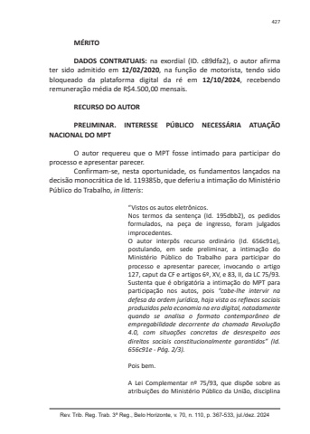 Rev. Trib. Reg. Trab. 3ª Reg., Belo Horizonte, v. 70, n. 110, p. 367-533, jul./dez. 2024427MÉRITODADOS CONTRATUAIS: na exordial (ID. c89dfa2), o autor afirma ter sido admitido em 12/02/2020, na função de motorista, tendo sido bloqueado da plataforma digital da ré em 12/10/2024, recebendo remuneração média de R$4.500,00 mensais.RECURSO DO AUTORPRELIMINAR. INTERESSE PÚBLICO NECESSÁRIA ATUAÇÃO NACIONAL DO MPTO autor requereu que o MPT fosse intimado para participar do processo e apresentar parecer.Confirmam-se, nesta oportunidade, os fundamentos lançados na decisão monocrática de Id. 119385b, que deferiu a intimação do Ministério Público do Trabalho, in litteris:“Vistos os autos eletrônicos.Nos termos da sentença (Id. 195dbb2), os pedidos formulados, na peça de ingresso, foram julgados improcedentes.O autor interpôs recurso ordinário (Id. 656c91e), postulando, em sede preliminar, a intimação do Ministério Público do Trabalho para participar do processo e apresentar parecer, invocando o artigo 127, caput da CF e artigos 6º, XV, e 83, II, da LC 75/93. Sustenta que é obrigatória a intimação do MPT para participação nos autos, pois “cabe-lhe intervir na defesa da ordem jurídica, haja vista os reflexos sociais produzidos pela economia na era digital, notadamente quando se analisa o formato contemporâneo de empregabilidade decorrente da chamada Revolução 4.0, com situações concretas de desrespeito aos direitos sociais constitucionalmente garantidos” (Id. 656c91e - Pág. 2/3).Pois bem.A Lei Complementar nº 75/93, que dispõe sobre as atribuições do Ministério Público da União, disciplina