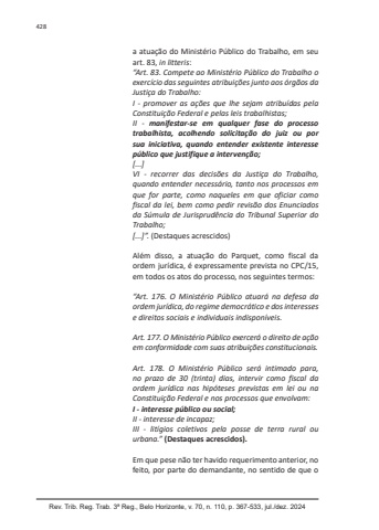 Rev. Trib. Reg. Trab. 3ª Reg., Belo Horizonte, v. 70, n. 110, p. 367-533, jul./dez. 2024428a atuação do Ministério Público do Trabalho, em seu art. 83, in litteris:“Art. 83. Compete ao Ministério Público do Trabalho o exercício das seguintes atribuições junto aos órgãos da Justiça do Trabalho:I - promover as ações que lhe sejam atribuídas pela Constituição Federal e pelas leis trabalhistas;II - manifestar-se em qualquer fase do processo trabalhista, acolhendo solicitação do juiz ou por sua iniciativa, quando entender existente interesse público que justifique a intervenção;[...]VI - recorrer das decisões da Justiça do Trabalho, quando entender necessário, tanto nos processos em que for parte, como naqueles em que oficiar como fiscal da lei, bem como pedir revisão dos Enunciados da Súmula de Jurisprudência do Tribunal Superior do Trabalho;[...]”. (Destaques acrescidos)Além disso, a atuação do Parquet, como fiscal da ordem jurídica, é expressamente prevista no CPC/15, em todos os atos do processo, nos seguintes termos:“Art. 176. O Ministério Público atuará na defesa da ordem jurídica, do regime democrático e dos interesses e direitos sociais e individuais indisponíveis.Art. 177. O Ministério Público exercerá o direito de ação em conformidade com suas atribuições constitucionais.Art. 178. O Ministério Público será intimado para, no prazo de 30 (trinta) dias, intervir como fiscal da ordem jurídica nas hipóteses previstas em lei ou na Constituição Federal e nos processos que envolvam:I - interesse público ou social;II - interesse de incapaz;III - litígios coletivos pela posse de terra rural ou urbana.” (Destaques acrescidos).Em que pese não ter havido requerimento anterior, no feito, por parte do demandante, no sentido de que o
