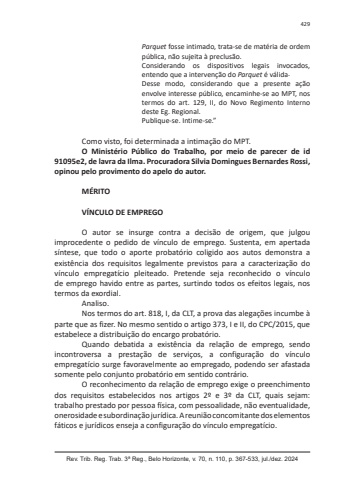 Rev. Trib. Reg. Trab. 3ª Reg., Belo Horizonte, v. 70, n. 110, p. 367-533, jul./dez. 2024429Parquet fosse intimado, trata-se de matéria de ordem pública, não sujeita à preclusão.Considerando os dispositivos legais invocados, entendo que a intervenção do Parquet é válida.Desse modo, considerando que a presente ação envolve interesse público, encaminhe-se ao MPT, nos termos do art. 129, II, do Novo Regimento Interno deste Eg. Regional.Publique-se. Intime-se.”Como visto, foi determinada a intimação do MPT.O Ministério Público do Trabalho, por meio de parecer de id 91095e2, de lavra da Ilma. Procuradora Silvia Domingues Bernardes Rossi, opinou pelo provimento do apelo do autor.MÉRITOVÍNCULO DE EMPREGOO autor se insurge contra a decisão de origem, que julgou improcedente o pedido de vínculo de emprego. Sustenta, em apertada síntese, que todo o aporte probatório coligido aos autos demonstra a existência dos requisitos legalmente previstos para a caracterização do vínculo empregatício pleiteado. Pretende seja reconhecido o vínculo de emprego havido entre as partes, surtindo todos os efeitos legais, nos termos da exordial.Analiso.Nos termos do art. 818, I, da CLT, a prova das alegações incumbe à parte que as fizer. No mesmo sentido o artigo 373, I e II, do CPC/2015, que estabelece a distribuição do encargo probatório.Quando debatida a existência da relação de emprego, sendo incontroversa a prestação de serviços, a configuração do vínculo empregatício surge favoravelmente ao empregado, podendo ser afastada somente pelo conjunto probatório em sentido contrário.O reconhecimento da relação de emprego exige o preenchimento dos requisitos estabelecidos nos artigos 2º e 3º da CLT, quais sejam: trabalho prestado por pessoa física, com pessoalidade, não eventualidade, onerosidade e subordinação jurídica. A reunião concomitante dos elementos fáticos e jurídicos enseja a configuração do vínculo empregatício.