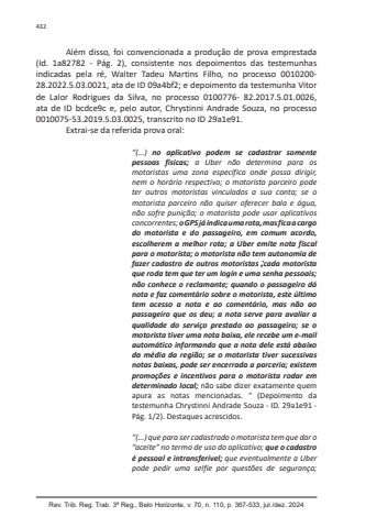 Rev. Trib. Reg. Trab. 3ª Reg., Belo Horizonte, v. 70, n. 110, p. 367-533, jul./dez. 2024432Além disso, foi convencionada a produção de prova emprestada (Id. 1a82782 - Pág. 2), consistente nos depoimentos das testemunhas indicadas pela ré, Walter Tadeu Martins Filho, no processo 0010200-28.2022.5.03.0021, ata de ID 09a4bf2; e depoimento da testemunha Vitor de Lalor Rodrigues da Silva, no processo 0100776- 82.2017.5.01.0026, ata de ID bcdce9c e, pelo autor, Chrystinni Andrade Souza, no processo 0010075-53.2019.5.03.0025, transcrito no ID 29a1e91.Extrai-se da referida prova oral:“(...) no aplicativo podem se cadastrar somente pessoas físicas; a Uber não determina para os motoristas uma zona específica onde possa dirigir, nem o horário respectivo; o motorista parceiro pode ter outros motoristas vinculados a sua conta; se o motorista parceiro não quiser oferecer bala e água, não sofre punição; o motorista pode usar aplicativos concorrentes; o GPS já indica uma rota, mas fica a cargo do motorista e do passageiro, em comum acordo, escolherem a melhor rota; a Uber emite nota fiscal para o motorista; o motorista não tem autonomia de fazer cadastro de outros motoristas cada motorista que roda tem que ter um login e uma senha pessoais; não conhece o reclamante; quando o passageiro dá nota e faz comentário sobre o motorista, este último tem acesso a nota e ao comentário, mas não ao passageiro que os deu; a nota serve para avaliar a qualidade do serviço prestado ao passageiro; se o motorista tiver uma nota baixa, ele recebe um e-mail automático informando que a nota dele está abaixo da média da região; se o motorista tiver sucessivas notas baixas, pode ser encerrada a parceria; existem promoções e incentivos para o motorista rodar em determinado local; não sabe dizer exatamente quem apura as notas mencionadas. “ (Depoimento da testemunha Chrystinni Andrade Souza - ID. 29a1e91 - Pág. 1/2). Destaques acrescidos.“(...) que para ser cadastrado o motorista tem que dar o “aceite” no termo de uso do aplicativo; que o cadastro é pessoal e intransferível; que eventualmente a Uber pode pedir uma selfie por questões de segurança;