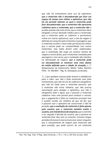 Rev. Trib. Reg. Trab. 3ª Reg., Belo Horizonte, v. 70, n. 110, p. 367-533, jul./dez. 2024433que não há treinamento para uso do aplicativo; que o motorista não é descadastrado por ficar um espaço de tempo sem utilizar o aplicativo; que não há um período máximo no qual o motorista pode ficar descadastrado; que o motorista não apresenta relatórios para a reclamada; que o motorista não é punido quando não está online; que o motorista não é obrigado a enviar atestado médico para a reclamada; que o motorista pode se cadastrar e permanecer online em outros aplicativos; que a rota da viagem é definida em conjunto pelo motorista e passageiro; que o motorista escolhe o local onde permanecerá online; que o veículo pode ser compartilhado com outros motoristas, mas todos devem estar cadastrados; que a reclamada não exige um número mínimo de viagens a serem feitas; que o motorista é avaliado pelo passageiro e vice-versa; que a avaliação não interfere na distribuição de viagens; que o motorista pode ser descadastrado se mantiver uma nota abaixo da média definida para a cidade de atuação; (...)” (Depoimento da testemunha Walter Tadeu Martins Filho - ID. 09a4bf2 - Pág. 4). Destaques acrescidos.“(...) que qualquer pessoa pode acessar a plataforma para a Uber; que não é feita entrevista nem feito treinamento; que não há uso de uniforme obrigatório; que não há chefe para o motorista parceiro; que o motorista não envia relatório; que não precisa autorização para desligar o aplicativo; que não é obrigatório bala e água; que é possível o motorista cadastrar mais uma pessoa para conduzir o veículo; que o pagamento é feito ao motorista principal mas o auxiliar recebe um relatório do que ele fez; que é possível usar o aplicativo de concorrente e não há punição; que a avaliação do motorista é feita apenas pelo usuário; que o motorista também avalia o usuário, sem interferência da empresa; que o caminho a ser seguido é decisão do usuário; que é possível ao motorista ficar dias sem se conectar, inclusive longos períodos (6 meses/1 ano) sem precisar avisar ninguém; que o cancelamento de viagem pelo motorista não gera punição; que pode ocorrer de um motorista