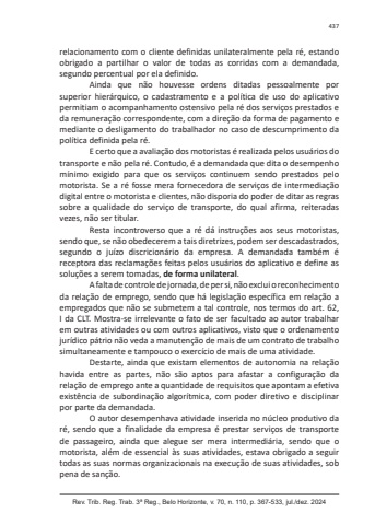 Rev. Trib. Reg. Trab. 3ª Reg., Belo Horizonte, v. 70, n. 110, p. 367-533, jul./dez. 2024437relacionamento com o cliente definidas unilateralmente pela ré, estando obrigado a partilhar o valor de todas as corridas com a demandada, segundo percentual por ela definido.Ainda que não houvesse ordens ditadas pessoalmente por superior hierárquico, o cadastramento e a política de uso do aplicativo permitiam o acompanhamento ostensivo pela ré dos serviços prestados e da remuneração correspondente, com a direção da forma de pagamento e mediante o desligamento do trabalhador no caso de descumprimento da política definida pela ré.E certo que a avaliação dos motoristas é realizada pelos usuários do transporte e não pela ré. Contudo, é a demandada que dita o desempenho mínimo exigido para que os serviços continuem sendo prestados pelo motorista. Se a ré fosse mera fornecedora de serviços de intermediação digital entre o motorista e clientes, não disporia do poder de ditar as regras sobre a qualidade do serviço de transporte, do qual afirma, reiteradas vezes, não ser titular.Resta incontroverso que a ré dá instruções aos seus motoristas, sendo que, se não obedecerem a tais diretrizes, podem ser descadastrados, segundo o juízo discricionário da empresa. A demandada também é receptora das reclamações feitas pelos usuários do aplicativo e define as soluções a serem tomadas, de forma unilateral.A falta de controle de jornada, de per si, não exclui o reconhecimento da relação de emprego, sendo que há legislação específica em relação a empregados que não se submetem a tal controle, nos termos do art. 62, I da CLT. Mostra-se irrelevante o fato de ser facultado ao autor trabalhar em outras atividades ou com outros aplicativos, visto que o ordenamento jurídico pátrio não veda a manutenção de mais de um contrato de trabalho simultaneamente e tampouco o exercício de mais de uma atividade.Destarte, ainda que existam elementos de autonomia na relação havida entre as partes, não são aptos para afastar a configuração da relação de emprego ante a quantidade de requisitos que apontam a efetiva existência de subordinação algorítmica, com poder diretivo e disciplinar por parte da demandada.O autor desempenhava atividade inserida no núcleo produtivo da ré, sendo que a finalidade da empresa é prestar serviços de transporte de passageiro, ainda que alegue ser mera intermediária, sendo que o motorista, além de essencial às suas atividades, estava obrigado a seguir todas as suas normas organizacionais na execução de suas atividades, sob pena de sanção.