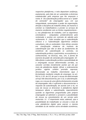 Rev. Trib. Reg. Trab. 3ª Reg., Belo Horizonte, v. 70, n. 110, p. 367-533, jul./dez. 2024447respectiva plataforma, e nela depositam confiança, exatamente, pelo fato de ser submetida a diretrizes estabelecidas pela empresa que lhe empresta o nome. 8 - Da subordinação jurídica extrai-se o “poder de comando” do empregador que, em sua integralidade, contemplam o poder de organização, direção e disciplina do trabalho alheio, de maneira a orientar os trabalhadores a prestar os serviços de maneira condizente com os limites regulamentares - e, nas plataformas de trabalho, com os algoritmos orientadores - estipulados unilateralmente pela reclamada e aceitos em contrato de adesão pelo reclamante. 9 - Cabe ressaltar que a subordinação clássica e a “subordinação algorítmica embora cumuláveis, não se confundem. Esta última consiste em classificação moderna do instituto da subordinação que não se deve ao fundamento da existência da subordinação (o contrato, na subordinação jurídica; o patrimônio, na econômica; o conhecimento, na técnica), mas, sim, à forma de exercício do poder de comando pelo empregador. 10 - Não afasta a subordinação jurídica a possibilidade de o empregado recusar determinadas corridas, ou cancelar corridas inicialmente aceitar por ele por meio da plataforma digital. Afinal, o ordenamento jurídico vigente contém previsão expressa, direcionada ao trabalho intermitente (que é formalizado mediante relação de emprego), no art. 452-A, § 3º, da CLT, de que a recusa de determinado serviço não descaracteriza, por si só, a subordinação. Logo, se a recusa de uma oferta diretamente oriunda do empregador não é suficiente a descaracterizar o requisito da subordinação, de acordo com a lei, no caso da recusa se direcionar à plataforma digital tampouco afasta a subordinação, especialmente quando os algoritmos programados pelo próprio empregador já admitem e preveem a possibilidade de recusa ou cancelamento de um serviço pelo motorista. 11 - É importante notar, ademais, que a possibilidade do trabalhador se vincular a mais de uma plataforma digital para exercer a mesma atividade ou de realizar outra atividade econômica,