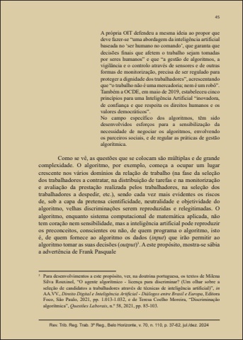 45Rev. Trib. Reg. Trab. 3ª Reg., Belo Horizonte, v. 70, n. 110, p. 37-62, jul./dez. 2024A própria OIT defendeu a mesma ideia ao propor que deve fazer-se “uma abordagem da inteligência artificial baseada no ‘ser humano no comando’, que garanta que decisões finais que afetem o trabalho sejam tomadas por seres humanos” e que “a gestão de algoritmos, a vigilância e o controlo através de sensores e de outras formas de monitorização, precisa de ser regulado para proteger a dignidade dos trabalhadores”, acrescentando que “o trabalho não é uma mercadoria; nem é um robô”.Também a OCDE, em maio de 2019, estabeleceu cinco princípios para uma Inteligência Artificial “inovadora, de confiança e que respeita os direitos humanos e os valores democráticos”.No campo específico dos algoritmos, têm sido desenvolvidos esforços para a sensibilização da necessidade de negociar os algoritmos, envolvendo os parceiros sociais, e de regular as práticas de gestão algorítmica.Como se vê, as questões que se colocam são múltiplas e de grande complexidade. O algoritmo, por exemplo, começa a ocupar um lugar crescente nos vários domínios da relação de trabalho (na fase da seleção dos trabalhadores a contratar, na distribuição de tarefas e na monitorização e avaliação da prestação realizada pelos trabalhadores, na seleção dos trabalhadores a despedir, etc.), sendo cada vez mais evidentes os riscos de, sob a capa da pretensa cientificidade, neutralidade e objetividade do algoritmo, velhas discriminações serem reproduzidas e relegitimadas. O algoritmo, enquanto sistema computacional de matemática aplicada, não tem coração nem sensibilidade, mas a inteligência artificial pode reproduzir os preconceitos, conscientes ou não, de quem programa o algoritmo, isto é, de quem fornece ao algoritmo os dados (input) que irão permitir ao algoritmo tomar as suas decisões (output)3. A este propósito, mostra-se sábia a advertência de Frank Pasquale3 Para desenvolvimentos a este propósito, ver, na doutrina portuguesa, os textos de Milena Silva Rouxinol, “O agente algorítmico - licença para discriminar? (Um olhar sobre a seleção de candidatos a trabalhadores através de técnicas de inteligência artifi cial)”, inAA.VV., Direito Digital e Inteligência Artifi cial - Diálogos entre Brasil e Europa, Editora Foco, São Paulo, 2021, pp. 1.013-1.032, e de Teresa Coelho Moreira, “Discriminação algorítmica”, Questões Laborais, n.º 58, 2021, pp. 85-103.