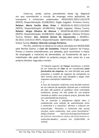 Rev. Trib. Reg. Trab. 3ª Reg., Belo Horizonte, v. 70, n. 110, p. 367-533, jul./dez. 2024451Citem-se, ainda, outros precedentes deste Eg. Regional em que reconhecido o vínculo de emprego entre aplicativos de transporte e motoristas cadastrados: 001031815.2022.5.03.0179 (ROPS), Disponibilização: 01/08/2022; Órgão Julgador: Primeira Turma; Relator: Maria Cecília Alves Pinto / 0010246-41.2022.5.03.0110 (ROPS); Disponibilização: 01ͭ08ͭ2022; Órgão Julgador: Oitava Turma; Relator: Sérgio Oliveira de Alencar / 0010258-68.2022.5.03.0041 (ROPS); Disponibilização: 01/08/2022; Órgão Julgador: Décima Primeira Turma; Relator: Des. Antonio Gomes de Vasconcelos / 0010911-82.2021.5.03.0113 (ROT); Disponibilização: 28/07/2022; Órgão Julgador: Oitava Turma; Relator: Marcelo Lamego Pertence.Por fim, conforme se observa na notícia veiculada em 04/03/2020 pela Revista Exame, a Cour de Cassation, Tribunal Superior da França, firmou o mesmo entendimento, ora adotado, para reconhecer o status de empregado a motorista da demandada, ao fundamento de que o trabalhador não pode definir os próprios preços, bem como ter a sua própria clientela. Segundo a revista:“O tribunal superior da França reconheceu o direito de um motorista da Uber de ser considerado como funcionário da empresa, em uma decisão que pode prejudicar o modelo de negócios da companhia ao abrir brecha para que seja obrigada a pagar mais impostos e benefícios trabalhistas.[...]A Cour de Cassation confirmou uma decisão anterior de um tribunal de apelação, dizendo que o motorista da Uber não poderia se qualificar como contratado autônomo, porque ele não podia ter sua própria clientela ou definir seus próprios preços, fazendo dele um subordinado da empresa.“Ao se conectar à plataforma digital Uber, é estabelecida uma relação de subordinação entre o motorista e a empresa”, afirmou o tribunal em comunicado. “Portanto, o motorista não presta serviços como autônomo, mas como funcionário.” (https://exame. abril.com.br/negocios/tribunalda-franca-reconhece-status-de-funcionario-amotorista-dauber/, acesso em 13/04/2020, às 15h53).