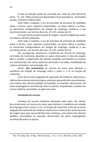 Rev. Trib. Reg. Trab. 3ª Reg., Belo Horizonte, v. 70, n. 110, p. 367-533, jul./dez. 2024452O teor da decisão pode ser acessado por meio do sítio oficial da corte, no link https://www.courdecassation.fr/jurisprudence 2/chambre sociale_576/374 4 44522.html.Ante todo o exposto, à luz do princípio da primazia da realidade sobre a forma, como restaram preenchidos, no plano fático e jurídico, os elementos configuradores da relação de emprego, impõe-se o seu reconhecimento, nos termos dos arts. 2º e 3º, ambos da CLT.Com permissiva venia ao juízo de origem, a prova coligida aos autos corrobora o direito pleiteado.Ante todo o exposto, à luz do princípio da primazia da realidade sobre a forma, como restaram preenchidos, no plano fático e jurídico, os elementos configuradores da relação de emprego, impõe-se o seu reconhecimento, nos termos dos arts. 2º e 3º, ambos da CLT.Por conseguinte, declara-se a existência do vínculo de emprego, na função de motorista, devendo os autos retornarem à Vara de origem para a análise e julgamento das demais questões pertinentes ao vínculo ora reconhecido, tais como, datas da admissão e da saída, modalidade da ruptura contratual, remuneração, etc.Assim, dou provimento ao recurso do autor para declarar a existência de relação de emprego entre o autor e a ré na função de motorista.A fim de se evitar alegação de supressão de instância, determino o retorno dos autos ao juízo de origem, para que seja proferida nova sentença, com exame dos demais pedidos formulados na exordial, decorrentes do liame empregatício reconhecido entre as partes. Prejudicada a análise das outras matérias veiculadas no apelo do autor.Conclusão do recursoConheço do recurso ordinário interposto pelo autor. No mérito, dou provimento ao recurso do autor para declarar a existência de relação de emprego entre o autor e a ré, na função de motorista. A fim de se evitar alegação de supressão de instância, determino o retorno dos autos ao juízo de origem para que seja proferida nova sentença, com exame dos demais pedidos, formulados na exordial, decorrentes do liame empregatício reconhecido entre as partes.