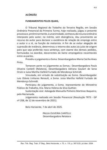 Rev. Trib. Reg. Trab. 3ª Reg., Belo Horizonte, v. 70, n. 110, p. 367-533, jul./dez. 2024453ACÓRDÃOFUNDAMENTOS PELOS QUAIS,O Tribunal Regional do Trabalho da Terceira Região, em Sessão Ordinária Presencial da Primeira Turma, hoje realizada, julgou o presente processo e, preliminarmente, à unanimidade, conheceu do recurso ordinário interposto pelo autor; no mérito, sem divergência, deu provimento ao recurso do autor para declarar a existência de relação de emprego entre o autor e a ré, na função de motorista. A fim de se evitar alegação de supressão de instância, determinou o retorno dos autos ao juízo de origem para que seja proferida nova sentença, com exame dos demais pedidos, formulados na exordial, decorrentes do liame empregatício reconhecido entre as partes.Presidiu o julgamento a Exma. Desembargadora Maria Cecília Alves Pinto.Tomaram parte no julgamento as Exmas.: Desembargadora Paula Oliveira Cantelli (Relatora), Desembargadora Adriana Goulart de Sena Orsini e Juíza Martha Halfeld Furtado de Mendonça Schmidt.Vinculada, em virtude de substituição ao Exmo. Desembargador Luiz Otávio Linhares Renault, a Exma. Juíza Martha Halfeld Furtado de Mendonça Schmidt.Participou do julgamento, a Exma. representante do Ministério Público do Trabalho, Dra. Maria Helena da Silva Guthier.Sustentação oral: Advogada Manuella Pinheiro Martinez Baqueiro, pelo Reclamada.Julgamento realizado em Sessão Presencial (Resolução TRT3 - GP nº 208, de 12 de novembro de 2021).Belo Horizonte, 7 de abril de 2025.PAULA OLIVEIRA CANTELLIDesembargadora Relatora