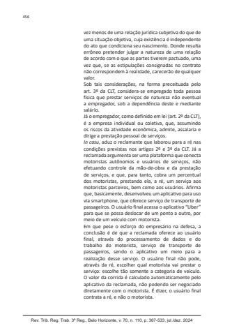 Rev. Trib. Reg. Trab. 3ª Reg., Belo Horizonte, v. 70, n. 110, p. 367-533, jul./dez. 2024456vez menos de uma relação jurídica subjetiva do que de uma situação objetiva, cuja existência é independente do ato que condiciona seu nascimento. Donde resulta errôneo pretender julgar a natureza de uma relação de acordo com o que as partes tiverem pactuado, uma vez que, se as estipulações consignadas no contrato não correspondem à realidade, carecerão de qualquer valor.Sob tais considerações, na forma preceituada pelo art. 3º da CLT, considera-se empregado toda pessoa física que prestar serviços de natureza não eventual a empregador, sob a dependência deste e mediante salário.Já o empregador, como definido em lei (art. 2º da CLT), é a empresa individual ou coletiva, que, assumindo os riscos da atividade econômica, admite, assalaria e dirige a prestação pessoal de serviços.In casu, aduz o reclamante que laborou para a ré nas condições previstas nos artigos 2º e 3º da CLT. Já a reclamada argumenta ser uma plataforma que conecta motoristas autônomos e usuários de serviços, não efetuando controle da mão-de-obra e da prestação de serviços, e que, para tanto, cobra um percentual dos motoristas, prestando ela, a ré, um serviço aos motoristas parceiros, bem como aos usuários. Afirma que, basicamente, desenvolveu um aplicativo para uso via smartphone, que oferece serviço de transporte de passageiros. O usuário final acessa o aplicativo “Uber” para que se possa deslocar de um ponto a outro, por meio de um veículo com motorista.Em que pese o esforço do empresário na defesa, a conclusão é de que a reclamada oferece ao usuário final, através do processamento de dados e do trabalho do motorista, serviço de transporte de passageiros, sendo o aplicativo um meio para a realização desse serviço. O usuário final não pode, através da ré, escolher qual motorista vai prestar o serviço: escolhe tão somente a categoria de veículo. O valor da corrida é calculado automaticamente pelo aplicativo da reclamada, não podendo ser negociado diretamente com o motorista. É dizer, o usuário final contrata a ré, e não o motorista.