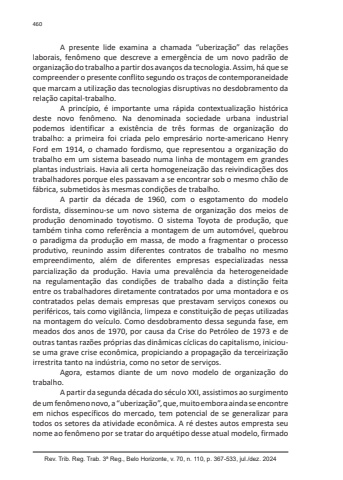 Rev. Trib. Reg. Trab. 3ª Reg., Belo Horizonte, v. 70, n. 110, p. 367-533, jul./dez. 2024460A presente lide examina a chamada “uberização” das relações laborais, fenômeno que descreve a emergência de um novo padrão de organização do trabalho a partir dos avanços da tecnologia. Assim, há que se compreender o presente conflito segundo os traços de contemporaneidade que marcam a utilização das tecnologias disruptivas no desdobramento da relação capital-trabalho.A princípio, é importante uma rápida contextualização histórica deste novo fenômeno. Na denominada sociedade urbana industrial podemos identificar a existência de três formas de organização do trabalho: a primeira foi criada pelo empresário norte-americano Henry Ford em 1914, o chamado fordismo, que representou a organização do trabalho em um sistema baseado numa linha de montagem em grandes plantas industriais. Havia ali certa homogeneização das reivindicações dos trabalhadores porque eles passavam a se encontrar sob o mesmo chão de fábrica, submetidos às mesmas condições de trabalho.A partir da década de 1960, com o esgotamento do modelo fordista, disseminou-se um novo sistema de organização dos meios de produção denominado toyotismo. O sistema Toyota de produção, que também tinha como referência a montagem de um automóvel, quebrou o paradigma da produção em massa, de modo a fragmentar o processo produtivo, reunindo assim diferentes contratos de trabalho no mesmo empreendimento, além de diferentes empresas especializadas nessa parcialização da produção. Havia uma prevalência da heterogeneidade na regulamentação das condições de trabalho dada a distinção feita entre os trabalhadores diretamente contratados por uma montadora e os contratados pelas demais empresas que prestavam serviços conexos ou periféricos, tais como vigilância, limpeza e constituição de peças utilizadas na montagem do veículo. Como desdobramento dessa segunda fase, em meados dos anos de 1970, por causa da Crise do Petróleo de 1973 e de outras tantas razões próprias das dinâmicas cíclicas do capitalismo, iniciouse uma grave crise econômica, propiciando a propagação da terceirização irrestrita tanto na indústria, como no setor de serviços.Agora, estamos diante de um novo modelo de organização do trabalho.A partir da segunda década do século XXI, assistimos ao surgimento de um fenômeno novo, a “uberização”, que, muito embora ainda se encontre em nichos específicos do mercado, tem potencial de se generalizar para todos os setores da atividade econômica. A ré destes autos empresta seu nome ao fenômeno por se tratar do arquétipo desse atual modelo, firmado
