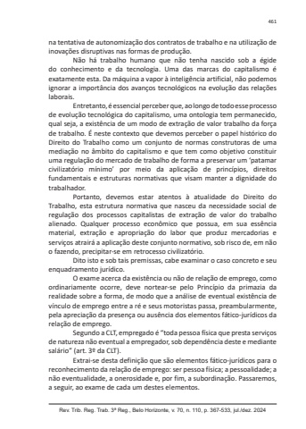 Rev. Trib. Reg. Trab. 3ª Reg., Belo Horizonte, v. 70, n. 110, p. 367-533, jul./dez. 2024461na tentativa de autonomização dos contratos de trabalho e na utilização de inovações disruptivas nas formas de produção.Não há trabalho humano que não tenha nascido sob a égide do conhecimento e da tecnologia. Uma das marcas do capitalismo é exatamente esta. Da máquina a vapor à inteligência artificial, não podemos ignorar a importância dos avanços tecnológicos na evolução das relações laborais.Entretanto, é essencial perceber que, ao longo de todo esse processo de evolução tecnológica do capitalismo, uma ontologia tem permanecido, qual seja, a existência de um modo de extração de valor trabalho da força de trabalho. É neste contexto que devemos perceber o papel histórico do Direito do Trabalho como um conjunto de normas construtoras de uma mediação no âmbito do capitalismo e que tem como objetivo constituir uma regulação do mercado de trabalho de forma a preservar um ‘patamar civilizatório mínimo’ por meio da aplicação de princípios, direitos fundamentais e estruturas normativas que visam manter a dignidade do trabalhador.Portanto, devemos estar atentos à atualidade do Direito do Trabalho, esta estrutura normativa que nasceu da necessidade social de regulação dos processos capitalistas de extração de valor do trabalho alienado. Qualquer processo econômico que possua, em sua essência material, extração e apropriação do labor que produz mercadorias e serviços atrairá a aplicação deste conjunto normativo, sob risco de, em não o fazendo, precipitar-se em retrocesso civilizatório.Dito isto e sob tais premissas, cabe examinar o caso concreto e seu enquadramento jurídico.O exame acerca da existência ou não de relação de emprego, como ordinariamente ocorre, deve nortear-se pelo Princípio da primazia da realidade sobre a forma, de modo que a análise de eventual existência de vínculo de emprego entre a ré e seus motoristas passa, preambularmente, pela apreciação da presença ou ausência dos elementos fático-jurídicos da relação de emprego.Segundo a CLT, empregado é “toda pessoa física que presta serviços de natureza não eventual a empregador, sob dependência deste e mediante salário” (art. 3º da CLT).Extrai-se desta definição que são elementos fático-jurídicos para o reconhecimento da relação de emprego: ser pessoa física; a pessoalidade; a não eventualidade, a onerosidade e, por fim, a subordinação. Passaremos, a seguir, ao exame de cada um destes elementos.