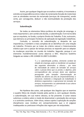 Rev. Trib. Reg. Trab. 3ª Reg., Belo Horizonte, v. 70, n. 110, p. 367-533, jul./dez. 2024467Assim, por qualquer ângulo que se analise a matéria, é inconteste a estreita correspondência entre o labor do reclamante (função de motorista) com as atividades normais da reclamada (serviços de transporte), sendo certo, por conseguinte, deduzir a não eventualidade da prestação dos serviços.SubordinaçãoDe todos os elementos fático-jurídicos da relação de emprego, o mais importante é, sem sombra de dúvida, a subordinação. É em torno dela que se arquiteta, no fundo, o próprio Direito do Trabalho. É ela, outrossim, que demarca as principais fronteiras de aplicação da legislação trabalhista.Contudo, o conceito de subordinação, a despeito de sua importância, é também o mais complexo de se identificar em uma relação de trabalho. Primeiro por se tratar de critério natural e historicamente elástico que com o passar do tempo precisou se expandir para se adaptar às mudanças ocorridas no mundo do trabalho. Segundo, porque é um elemento multidimensional como observa o Min. Mauricio Godinho Delgado ao relatar o RR-119400-55.2007.5.03.0001:“(...) a subordinação jurídica, elemento cardeal da relação de emprego, pode se manifestar em qualquer das seguintes dimensões: a clássica , por meio da intensidade de ordens do tomador de serviços sobre a pessoa física que os presta; a objetiva, pela correspondência dos serviços deste aos objetivos perseguidos pelo tomador (harmonização do trabalho do obreiro aos fins do empreendimento); a estrutural, mediante a integração do trabalhador à dinâmica organizativa e operacional do tomador de serviços, incorporando e se submetendo à sua cultura corporativa dominante (...).”Na hipótese dos autos, sob qualquer dos ângulos que se examine o quadro fático da relação travada pelas partes e, sem qualquer dúvida, a subordinação, em sua matriz clássica, se faz presente. O autor estava submisso a ordens sobre o modo de desenvolver a prestação dos serviços e a controles contínuos. Além disso, estava sujeito à aplicação de sanções disciplinares caso incidisse em comportamentos que a ré julgasse inadequados ou praticasse infrações das regras por ela estipuladas.