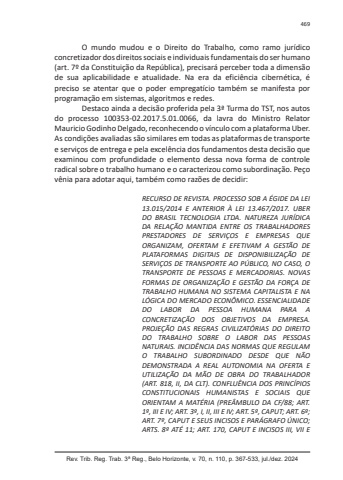 Rev. Trib. Reg. Trab. 3ª Reg., Belo Horizonte, v. 70, n. 110, p. 367-533, jul./dez. 2024469O mundo mudou e o Direito do Trabalho, como ramo jurídico concretizador dos direitos sociais e individuais fundamentais do ser humano (art. 7º da Constituição da República), precisará perceber toda a dimensão de sua aplicabilidade e atualidade. Na era da eficiência cibernética, é preciso se atentar que o poder empregatício também se manifesta por programação em sistemas, algoritmos e redes.Destaco ainda a decisão proferida pela 3ª Turma do TST, nos autos do processo 100353-02.2017.5.01.0066, da lavra do Ministro Relator Mauricio Godinho Delgado, reconhecendo o vínculo com a plataforma Uber. As condições avaliadas são similares em todas as plataformas de transporte e serviços de entrega e pela excelência dos fundamentos desta decisão que examinou com profundidade o elemento dessa nova forma de controle radical sobre o trabalho humano e o caracterizou como subordinação. Peço vênia para adotar aqui, também como razões de decidir:RECURSO DE REVISTA. PROCESSO SOB A ÉGIDE DA LEI 13.015/2014 E ANTERIOR À LEI 13.467/2017. UBER DO BRASIL TECNOLOGIA LTDA. NATUREZA JURÍDICA DA RELAÇÃO MANTIDA ENTRE OS TRABALHADORES PRESTADORES DE SERVIÇOS E EMPRESAS QUE ORGANIZAM, OFERTAM E EFETIVAM A GESTÃO DE PLATAFORMAS DIGITAIS DE DISPONIBILIZAÇÃO DE SERVIÇOS DE TRANSPORTE AO PÚBLICO, NO CASO, O TRANSPORTE DE PESSOAS E MERCADORIAS. NOVAS FORMAS DE ORGANIZAÇÃO E GESTÃO DA FORÇA DE TRABALHO HUMANA NO SISTEMA CAPITALISTA E NA LÓGICA DO MERCADO ECONÔMICO. ESSENCIALIDADE DO LABOR DA PESSOA HUMANA PARA A CONCRETIZAÇÃO DOS OBJETIVOS DA EMPRESA. PROJEÇÃO DAS REGRAS CIVILIZATÓRIAS DO DIREITO DO TRABALHO SOBRE O LABOR DAS PESSOAS NATURAIS. INCIDÊNCIA DAS NORMAS QUE REGULAM O TRABALHO SUBORDINADO DESDE QUE NÃO DEMONSTRADA A REAL AUTONOMIA NA OFERTA E UTILIZAÇÃO DA MÃO DE OBRA DO TRABALHADOR (ART. 818, II, DA CLT). CONFLUÊNCIA DOS PRINCÍPIOS CONSTITUCIONAIS HUMANISTAS E SOCIAIS QUE ORIENTAM A MATÉRIA (PREÂMBULO DA CF/88; ART. 1º, III E IV; ART. 3º, I, II, III E IV; ART. 5º, CAPUT; ART. 6º; ART. 7º, CAPUT E SEUS INCISOS E PARÁGRAFO ÚNICO; ARTS. 8º ATÉ 11; ART. 170, CAPUT E INCISOS III, VII E