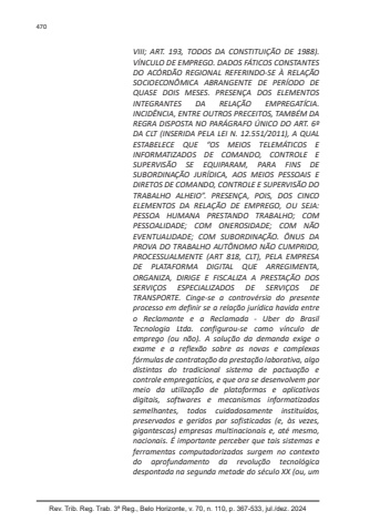 Rev. Trib. Reg. Trab. 3ª Reg., Belo Horizonte, v. 70, n. 110, p. 367-533, jul./dez. 2024470VIII; ART. 193, TODOS DA CONSTITUIÇÃO DE 1988). VÍNCULO DE EMPREGO. DADOS FÁTICOS CONSTANTES DO ACÓRDÃO REGIONAL REFERINDO-SE À RELAÇÃO SOCIOECONÔMICA ABRANGENTE DE PERÍODO DE QUASE DOIS MESES. PRESENÇA DOS ELEMENTOS INTEGRANTES DA RELAÇÃO EMPREGATÍCIA. INCIDÊNCIA, ENTRE OUTROS PRECEITOS, TAMBÉM DA REGRA DISPOSTA NO PARÁGRAFO ÚNICO DO ART. 6º DA CLT (INSERIDA PELA LEI N. 12.551/2011), A QUAL ESTABELECE QUE “OS MEIOS TELEMÁTICOS E INFORMATIZADOS DE COMANDO, CONTROLE E SUPERVISÃO SE EQUIPARAM, PARA FINS DE SUBORDINAÇÃO JURÍDICA, AOS MEIOS PESSOAIS E DIRETOS DE COMANDO, CONTROLE E SUPERVISÃO DO TRABALHO ALHEIO”. PRESENÇA, POIS, DOS CINCO ELEMENTOS DA RELAÇÃO DE EMPREGO, OU SEJA: PESSOA HUMANA PRESTANDO TRABALHO; COM PESSOALIDADE; COM ONEROSIDADE; COM NÃO EVENTUALIDADE; COM SUBORDINAÇÃO. ÔNUS DA PROVA DO TRABALHO AUTÔNOMO NÃO CUMPRIDO, PROCESSUALMENTE (ART 818, CLT), PELA EMPRESA DE PLATAFORMA DIGITAL QUE ARREGIMENTA, ORGANIZA, DIRIGE E FISCALIZA A PRESTAÇÃO DOS SERVIÇOS ESPECIALIZADOS DE SERVIÇOS DE TRANSPORTE. Cinge-se a controvérsia do presente processo em definir se a relação jurídica havida entre o Reclamante e a Reclamada - Uber do Brasil Tecnologia Ltda. configurou-se como vínculo de emprego (ou não). A solução da demanda exige o exame e a reflexão sobre as novas e complexas fórmulas de contratação da prestação laborativa, algo distintas do tradicional sistema de pactuação e controle empregatícios, e que ora se desenvolvem por meio da utilização de plataformas e aplicativos digitais, softwares e mecanismos informatizados semelhantes, todos cuidadosamente instituídos, preservados e geridos por sofisticadas (e, às vezes, gigantescas) empresas multinacionais e, até mesmo, nacionais. É importante perceber que tais sistemas e ferramentas computadorizados surgem no contexto do aprofundamento da revolução tecnológica despontada na segunda metade do século XX (ou, um