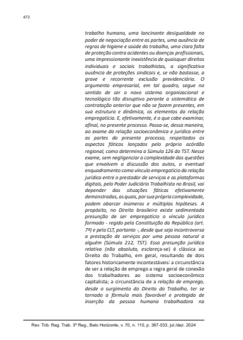 Rev. Trib. Reg. Trab. 3ª Reg., Belo Horizonte, v. 70, n. 110, p. 367-533, jul./dez. 2024472trabalho humano, uma lancinante desigualdade no poder de negociação entre as partes, uma ausência de regras de higiene e saúde do trabalho, uma clara falta de proteção contra acidentes ou doenças profissionais, uma impressionante inexistência de quaisquer direitos individuais e sociais trabalhistas, a significativa ausência de proteções sindicais e, se não bastasse, a grave e recorrente exclusão previdenciária. O argumento empresarial, em tal quadro, segue no sentido de ser o novo sistema organizacional e tecnológico tão disruptivo perante a sistemática de contratação anterior que não se fazem presentes, em sua estrutura e dinâmica, os elementos da relação empregatícia. E, efetivamente, é o que cabe examinar, afinal, no presente processo. Passa-se, dessa maneira, ao exame da relação socioeconômica e jurídica entre as partes do presente processo, respeitados os aspectos fáticos lançados pelo próprio acórdão regional, como determina a Súmula 126 do TST. Nesse exame, sem negligenciar a complexidade das questões que envolvem a discussão dos autos, o eventual enquadramento como vínculo empregatício da relação jurídica entre o prestador de serviços e as plataformas digitais, pelo Poder Judiciário Trabalhista no Brasil, vai depender das situações fáticas efetivamente demonstradas, as quais, por sua própria complexidade, podem abarcar inúmeras e múltiplas hipóteses. A propósito, no Direito brasileiro existe sedimentada presunção de ser empregatício o vínculo jurídico formado - regido pela Constituição da República (art. 7º) e pela CLT, portanto -, desde que seja incontroversa a prestação de serviços por uma pessoa natural a alguém (Súmula 212, TST). Essa presunção jurídica relativa (não absoluta, esclareça-se) é clássica ao Direito do Trabalho, em geral, resultando de dois fatores historicamente incontestáveis: a circunstância de ser a relação de emprego a regra geral de conexão dos trabalhadores ao sistema socioeconômico capitalista; a circunstância de a relação de emprego, desde o surgimento do Direito do Trabalho, ter se tornado a fórmula mais favorável e protegida de inserção da pessoa humana trabalhadora na