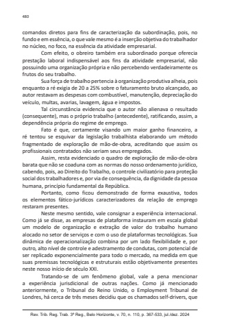 Rev. Trib. Reg. Trab. 3ª Reg., Belo Horizonte, v. 70, n. 110, p. 367-533, jul./dez. 2024480comandos diretos para fins de caracterização da subordinação, pois, no fundo e em essência, o que vale mesmo é a inserção objetiva do trabalhador no núcleo, no foco, na essência da atividade empresarial.Com efeito, o obreiro também era subordinado porque oferecia prestação laboral indispensável aos fins da atividade empresarial, não possuindo uma organização própria e não percebendo verdadeiramente os frutos do seu trabalho.Sua força de trabalho pertencia à organização produtiva alheia, pois enquanto a ré exigia de 20 a 25% sobre o faturamento bruto alcançado, ao autor restavam as despesas com combustível, manutenção, depreciação do veículo, multas, avarias, lavagem, água e impostos.Tal circunstância evidencia que o autor não alienava o resultado (consequente), mas o próprio trabalho (antecedente), ratificando, assim, a dependência própria do regime de emprego.Fato é que, certamente visando um maior ganho financeiro, a ré tentou se esquivar da legislação trabalhista elaborando um método fragmentado de exploração de mão-de-obra, acreditando que assim os profissionais contratados não seriam seus empregados.Assim, resta evidenciado o quadro de exploração de mão-de-obra barata que não se coaduna com as normas do nosso ordenamento jurídico, cabendo, pois, ao Direito do Trabalho, o controle civilizatório para proteção social dos trabalhadores e, por via de consequência, da dignidade da pessoa humana, princípio fundamental da República.Portanto, como ficou demonstrado de forma exaustiva, todos os elementos fático-jurídicos caracterizadores da relação de emprego restaram presentes.Neste mesmo sentido, vale consignar a experiência internacional. Como já se disse, as empresas de plataforma instauram em escala global um modelo de organização e extração de valor do trabalho humano alocado no setor de serviços e com o uso de plataformas tecnológicas. Sua dinâmica de operacionalização combina por um lado flexibilidade e, por outro, alto nível de controle e adestramento de condutas, com potencial de ser replicado exponencialmente para todo o mercado, na medida em que suas premissas tecnológicas e estruturais estão objetivamente presentes neste nosso início de século XXI.Tratando-se de um fenômeno global, vale a pena mencionar a experiência jurisdicional de outras nações. Como já mencionado anteriormente, o Tribunal do Reino Unido, o Employment Tribunal de Londres, há cerca de três meses decidiu que os chamados self-drivers, que