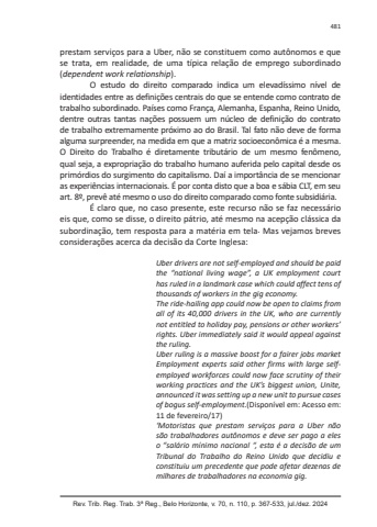 Rev. Trib. Reg. Trab. 3ª Reg., Belo Horizonte, v. 70, n. 110, p. 367-533, jul./dez. 2024481prestam serviços para a Uber, não se constituem como autônomos e que se trata, em realidade, de uma típica relação de emprego subordinado (dependent work relationship).O estudo do direito comparado indica um elevadíssimo nível de identidades entre as definições centrais do que se entende como contrato de trabalho subordinado. Países como França, Alemanha, Espanha, Reino Unido, dentre outras tantas nações possuem um núcleo de definição do contrato de trabalho extremamente próximo ao do Brasil. Tal fato não deve de forma alguma surpreender, na medida em que a matriz socioeconômica é a mesma. O Direito do Trabalho é diretamente tributário de um mesmo fenômeno, qual seja, a expropriação do trabalho humano auferida pelo capital desde os primórdios do surgimento do capitalismo. Daí a importância de se mencionar as experiências internacionais. É por conta disto que a boa e sábia CLT, em seu art. 8º, prevê até mesmo o uso do direito comparado como fonte subsidiária.É claro que, no caso presente, este recurso não se faz necessário eis que, como se disse, o direito pátrio, até mesmo na acepção clássica da subordinação, tem resposta para a matéria em tela. Mas vejamos breves considerações acerca da decisão da Corte Inglesa:Uber drivers are not self-employed and should be paid the “national living wage”, a UK employment court has ruled in a landmark case which could affect tens of thousands of workers in the gig economy.The ride-hailing app could now be open to claims from all of its 40,000 drivers in the UK, who are currently not entitled to holiday pay, pensions or other workers’ rights. Uber immediately said it would appeal against the ruling.Uber ruling is a massive boost for a fairer jobs market Employment experts said other firms with large selfemployed workforces could now face scrutiny of their working practices and the UK’s biggest union, Unite, announced it was setting up a new unit to pursue cases of bogus self-employment.(Disponível em: Acesso em: 11 de fevereiro/17)‘Motoristas que prestam serviços para a Uber não são trabalhadores autônomos e deve ser pago a eles o “salário mínimo nacional “, esta é a decisão de um Tribunal do Trabalho do Reino Unido que decidiu e constituiu um precedente que pode afetar dezenas de milhares de trabalhadores na economia gig.