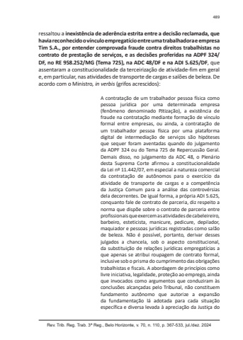 Rev. Trib. Reg. Trab. 3ª Reg., Belo Horizonte, v. 70, n. 110, p. 367-533, jul./dez. 2024489ressaltou a inexistência de aderência estrita entre a decisão reclamada, que havia reconhecido o vínculo empregatício entre uma trabalhadora e empresa Tim S.A., por entender comprovada fraude contra direitos trabalhistas no contrato de prestação de serviços, e as decisões proferidas na ADPF 324/DF, no RE 958.252/MG (Tema 725), na ADC 48/DF e na ADI 5.625/DF, que assentaram a constitucionalidade da terceirização de atividade-fim em geral e, em particular, nas atividades de transporte de cargas e salões de beleza. De acordo com o Ministro, in verbis (grifos acrescidos):A contratação de um trabalhador pessoa física como pessoa jurídica por uma determinada empresa (fenômeno denominado PJtização), a existência de fraude na contratação mediante formação de vínculo formal entre empresas, ou ainda, a contratação de um trabalhador pessoa física por uma plataforma digital de intermediação de serviços são hipóteses que sequer foram aventadas quando do julgamento da ADPF 324 ou do Tema 725 de Repercussão Geral. Demais disso, no julgamento da ADC 48, o Plenário desta Suprema Corte afirmou a constitucionalidade da Lei nº 11.442/07, em especial a natureza comercial da contratação de autônomos para o exercício da atividade de transporte de cargas e a competência da Justiça Comum para a análise das controvérsias dela decorrentes. De igual forma, a própria ADI 5.625, conquanto fale de contrato de parceria, diz respeito a norma que dispõe sobre o contrato de parceria entre profissionais que exercem as atividades de cabeleireiro, barbeiro, esteticista, manicure, pedicure, depilador, maquiador e pessoas jurídicas registradas como salão de beleza. Não é possível, portanto, derivar desses julgados a chancela, sob o aspecto constitucional, da substituição de relações jurídicas empregatícias a que apenas se atribui roupagem de contrato formal, inclusive sob o prisma do cumprimento das obrigações trabalhistas e fiscais. A abordagem de princípios como livre iniciativa, legalidade, proteção ao emprego, ainda que invocados como argumentos que conduziram às conclusões alcançadas pelo Tribunal, não constituem fundamento autônomo que autorize a expansão da fundamentação lá adotada para cada situação específica e diversa levada à apreciação da Justiça do