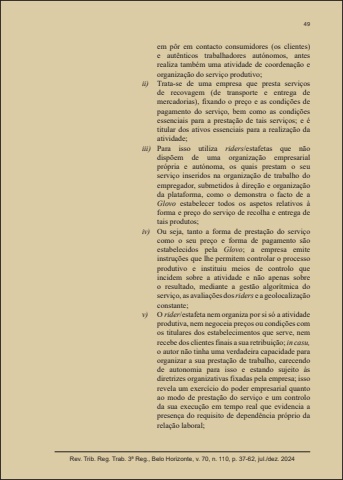 49Rev. Trib. Reg. Trab. 3ª Reg., Belo Horizonte, v. 70, n. 110, p. 37-62, jul./dez. 2024em pôr em contacto consumidores (os clientes) e autênticos trabalhadores autónomos, antes realiza também uma atividade de coordenação e organização do serviço produtivo;ii) Trata-se de uma empresa que presta serviços de recovagem (de transporte e entrega de mercadorias), fixando o preço e as condições de pagamento do serviço, bem como as condições essenciais para a prestação de tais serviços; e é titular dos ativos essenciais para a realização da atividade;iii) Para isso utiliza riders/estafetas que não dispõem de uma organização empresarial própria e autónoma, os quais prestam o seu serviço inseridos na organização de trabalho do empregador, submetidos à direção e organização da plataforma, como o demonstra o facto de a Glovo estabelecer todos os aspetos relativos à forma e preço do serviço de recolha e entrega de tais produtos;iv) Ou seja, tanto a forma de prestação do serviço como o seu preço e forma de pagamento são estabelecidos pela Glovo; a empresa emite instruções que lhe permitem controlar o processo produtivo e instituiu meios de controlo que incidem sobre a atividade e não apenas sobre o resultado, mediante a gestão algorítmica do serviço, as avaliações dos riders e a geolocalização constante;v) O rider/estafeta nem organiza por si só a atividade produtiva, nem negoceia preços ou condições com os titulares dos estabelecimentos que serve, nem recebe dos clientes finais a sua retribuição; in casu,o autor não tinha uma verdadeira capacidade para organizar a sua prestação de trabalho, carecendo de autonomia para isso e estando sujeito às diretrizes organizativas fixadas pela empresa; isso revela um exercício do poder empresarial quanto ao modo de prestação do serviço e um controlo da sua execução em tempo real que evidencia a presença do requisito de dependência próprio da relação laboral;