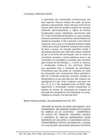 Rev. Trib. Reg. Trab. 3ª Reg., Belo Horizonte, v. 70, n. 110, p. 367-533, jul./dez. 2024491E concluiu o Ministro Fachin:A apreciação das reclamações constitucionais por este Supremo Tribunal Federal não pode, de forma abstrata e generalizada, impor natureza comercial ao vínculo decorrente de qualquer espécie de contrato, excluindo, aprioristicamente, o regime de direitos fundamentais sociais trabalhistas preconizado pelo art. 7º da Constituição da República, se, nessa relação, estiverem presentes os elementos caracterizadores da relação de emprego. E não é possível a este Tribunal reapreciar caso a caso as minudentes análises levadas a efeito pela Justiça Trabalhista mediante nova análise de fatos e provas. Na situação específica trazida à apreciação, portanto, que nada refere sobre a validade de per si da forma de contratação, não há como se reconhecer presente a estrita aderência entre o ato reclamado e os paradigmas invocados que concluem pela licitude da terceirização. [...] Como se observa, a condenação fundou-se em premissas fáticas que apontavam para a invalidade da contratação, circunstância que não pode ser revisitada em sede de reclamação sem revolvimento fático probatório. Não há na decisão reclamada, portanto, violação ou desobediência ao que decidido por este Tribunal nos paradigmas em tela. Ante o exposto, com base nos arts. 21, § 1º, e 161, parágrafo único, do RISTF, nego seguimento à reclamação, ficando prejudicados os pedidos de liminar, de instauração de Incidente de Assunção de Competência e de habilitação nos autos. Publique-se. Brasília, 9 de abril de 2024.Nesse mesmo sentido, cito precedentes do Col. TST:“RECURSO DE REVISTA DA PARTE RECLAMANTE. RITO SUMARÍSSIMO - RECLAMAÇÃO TRABALHISTA AJUIZADA NA VIGÊNCIA DA LEI 13.467/2017 - COMPETÊNCIA DA JUSTIÇA DO TRABALHO. DISCUSSÃO QUANTO À EXISTÊNCIA DE VÍNCULO EMPREGATÍCIO ENTRE MOTORISTA DE APLICATIVO E PLATAFORMA DIGITAL. TRANSCENDÊNCIA POLÍTICA RECONHECIDA. O pedido e a causa de pedir apresentados pela parte reclamante