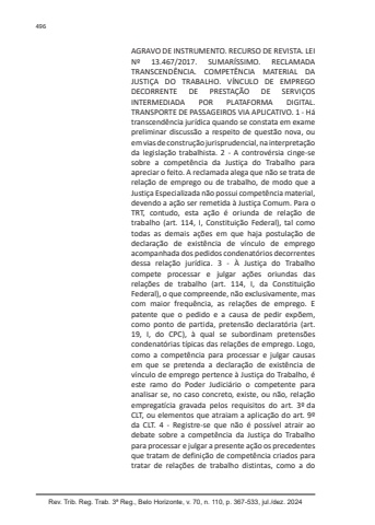 Rev. Trib. Reg. Trab. 3ª Reg., Belo Horizonte, v. 70, n. 110, p. 367-533, jul./dez. 2024496AGRAVO DE INSTRUMENTO. RECURSO DE REVISTA. LEI Nº 13.467/2017. SUMARÍSSIMO. RECLAMADA TRANSCENDÊNCIA. COMPETÊNCIA MATERIAL DA JUSTIÇA DO TRABALHO. VÍNCULO DE EMPREGO DECORRENTE DE PRESTAÇÃO DE SERVIÇOS INTERMEDIADA POR PLATAFORMA DIGITAL. TRANSPORTE DE PASSAGEIROS VIA APLICATIVO. 1 - Há transcendência jurídica quando se constata em exame preliminar discussão a respeito de questão nova, ou em vias de construção jurisprudencial, na interpretação da legislação trabalhista. 2 - A controvérsia cinge-se sobre a competência da Justiça do Trabalho para apreciar o feito. A reclamada alega que não se trata de relação de emprego ou de trabalho, de modo que a Justiça Especializada não possui competência material, devendo a ação ser remetida à Justiça Comum. Para o TRT, contudo, esta ação é oriunda de relação de trabalho (art. 114, I, Constituição Federal), tal como todas as demais ações em que haja postulação de declaração de existência de vínculo de emprego acompanhada dos pedidos condenatórios decorrentes dessa relação jurídica. 3 - À Justiça do Trabalho compete processar e julgar ações oriundas das relações de trabalho (art. 114, I, da Constituição Federal), o que compreende, não exclusivamente, mas com maior frequência, as relações de emprego. E patente que o pedido e a causa de pedir expõem, como ponto de partida, pretensão declaratória (art. 19, I, do CPC), à qual se subordinam pretensões condenatórias típicas das relações de emprego. Logo, como a competência para processar e julgar causas em que se pretenda a declaração de existência de vínculo de emprego pertence à Justiça do Trabalho, é este ramo do Poder Judiciário o competente para analisar se, no caso concreto, existe, ou não, relação empregatícia gravada pelos requisitos do art. 3º da CLT, ou elementos que atraiam a aplicação do art. 9º da CLT. 4 - Registre-se que não é possível atrair ao debate sobre a competência da Justiça do Trabalho para processar e julgar a presente ação os precedentes que tratam de definição de competência criados para tratar de relações de trabalho distintas, como a do